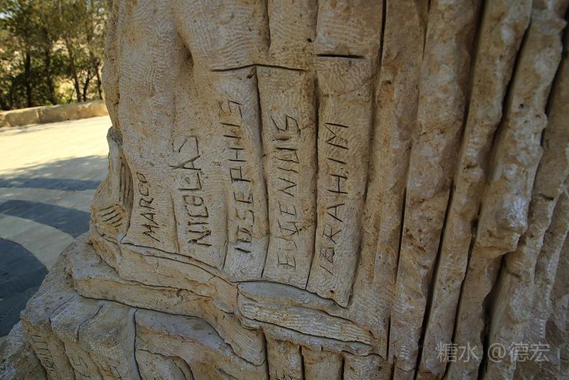 石碑正面看是一张脸,侧面看则是书页与许多张脸,而背面印着圣父圣子的手印。 小白领着我们来到山顶,山顶上一块石牌指示着由此到耶路撒冷等地的方向和距离。