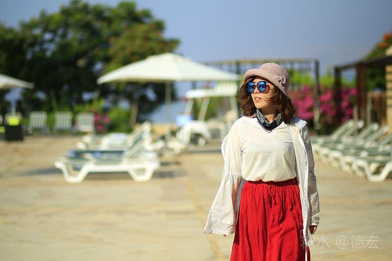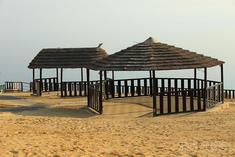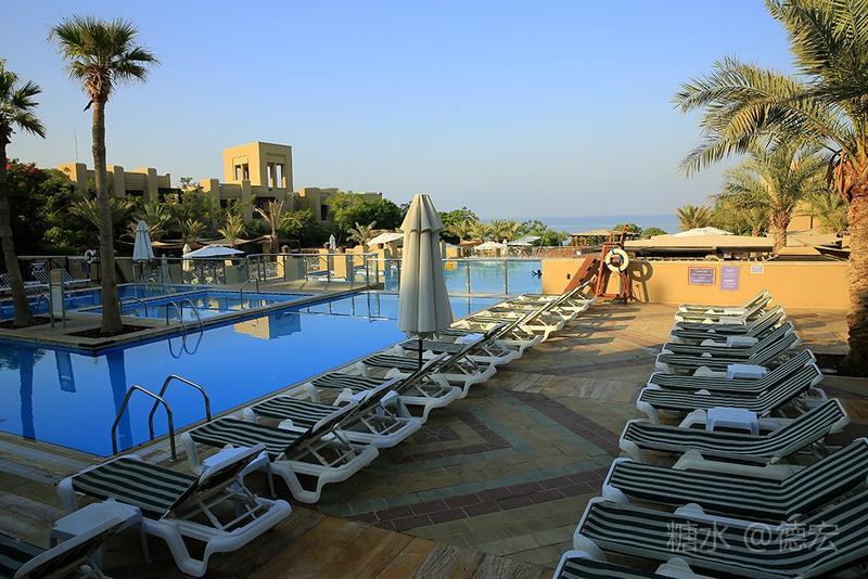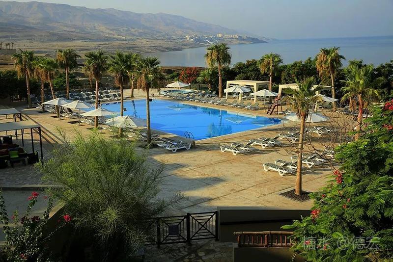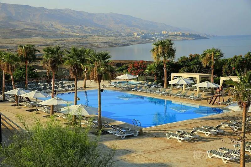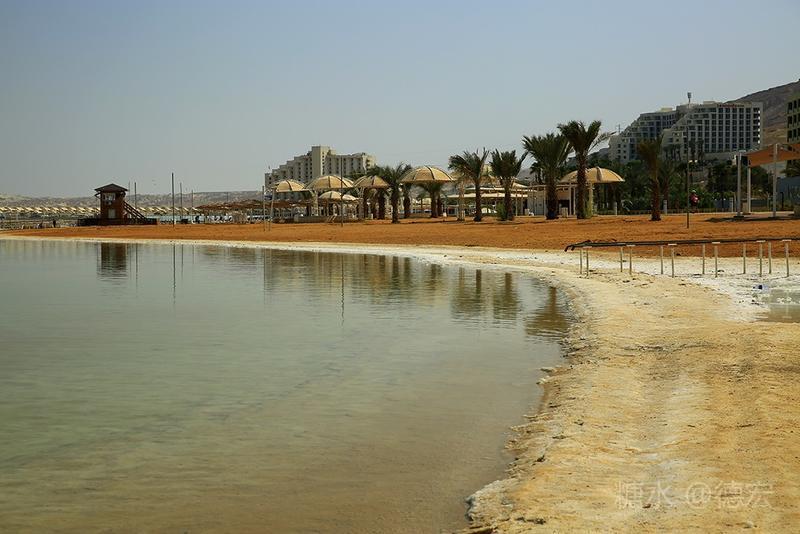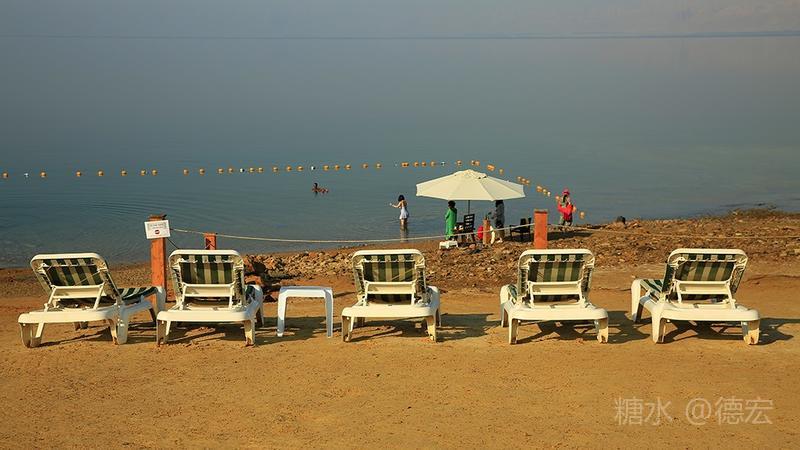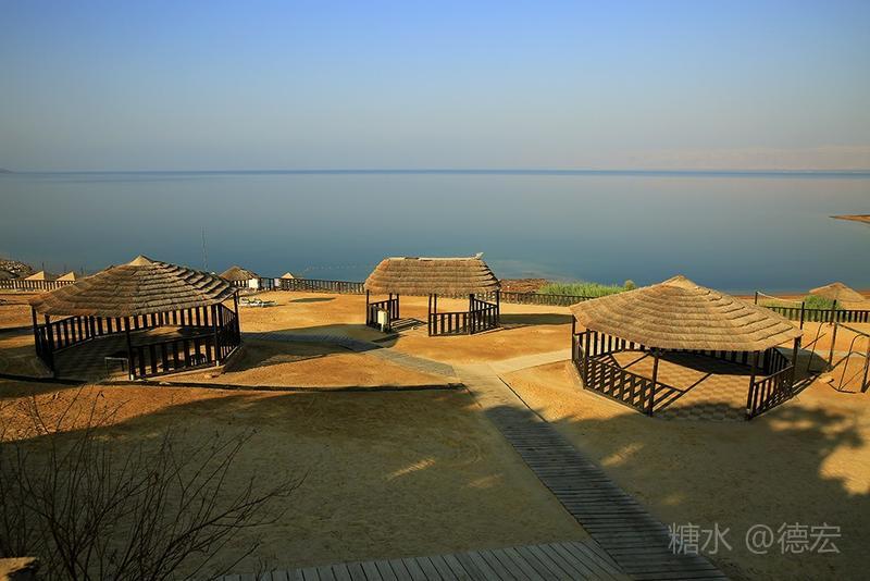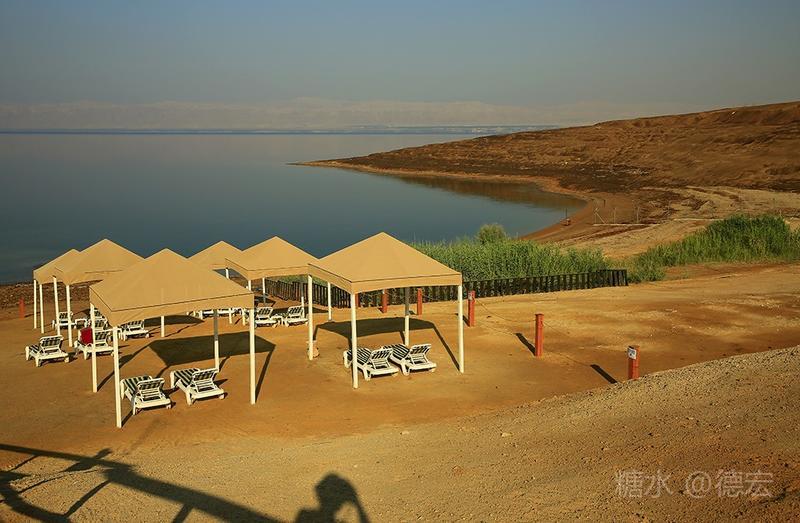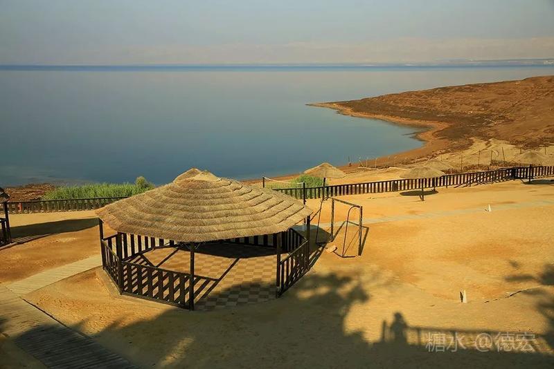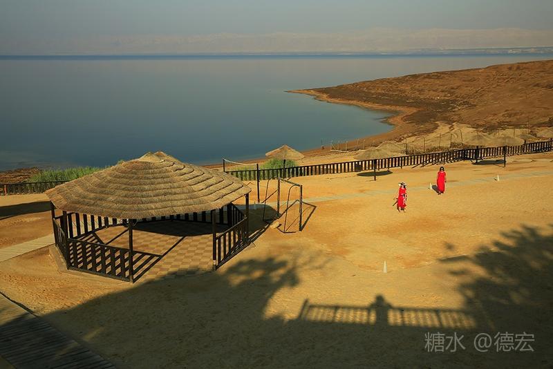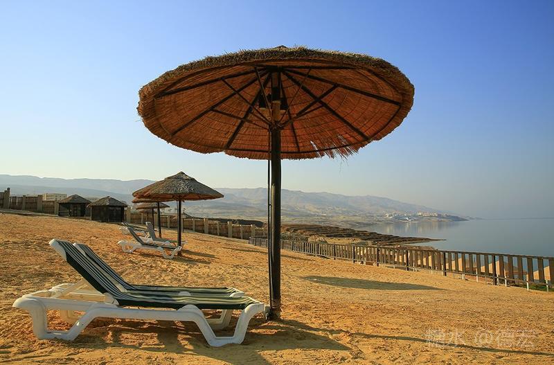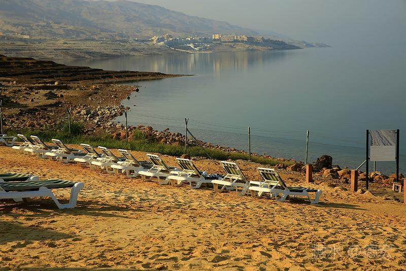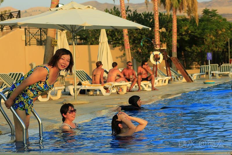 死海有许多世界之最:世界最低的湖,世界陆地的最低点,世界最深的咸水湖,世界最咸的湖……湖面海拔-422米的死海,原本只存在于《自然科学》课本上的神奇地方——万物无法生存,鱼儿到来就会死去,连飞鸟都不会造访,然而却是一片可以任意浮在水面的“海”。 从尼泊山一路下行到死海,耳膜也会随着气压的改变而出现轻微的不适。最有趣的还是空瓶,随手取一个拧紧了瓶盖的空塑料瓶,一路到了死海边,瓶身早已被改变的气压压瘪,很有意思。 也许是地势更低,死海的温度也要比其它地方热一些。下午五点左右,我们来到死海假日酒店,放下行李,换上泳装赶紧去海边。