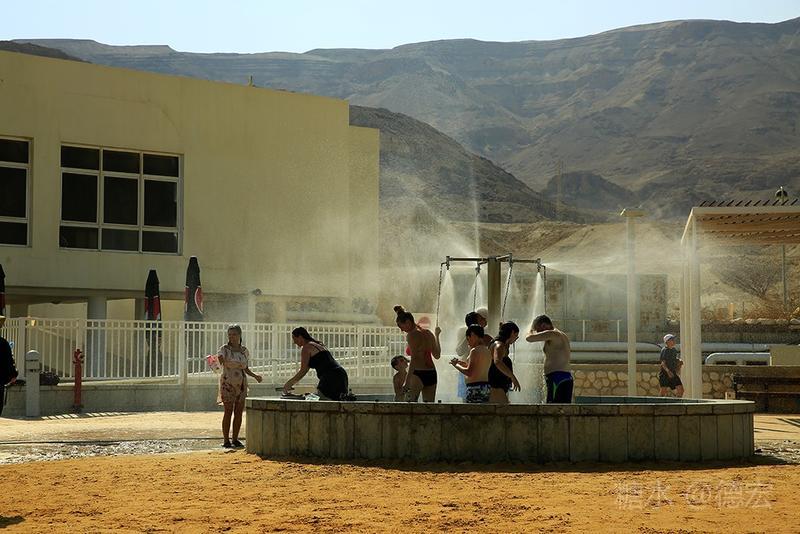 时代在发展,社会在进步,不知道人民公社式的基布兹还能存在多久,不论将来如何,基布兹都在以色列的建国和发展过程中起着重要的积极的作用,这就够了。 大巴在以色列境内沿着死海边开了近1小时,终于来到就餐地。对以色列的餐不太感兴趣,倒是沿途的死海美景非同凡响。餐后,顶着火辣辣的阳光,我们来到以色列境内的死海边,岸边的结晶盐非常明显,白花花一片,神奇不?