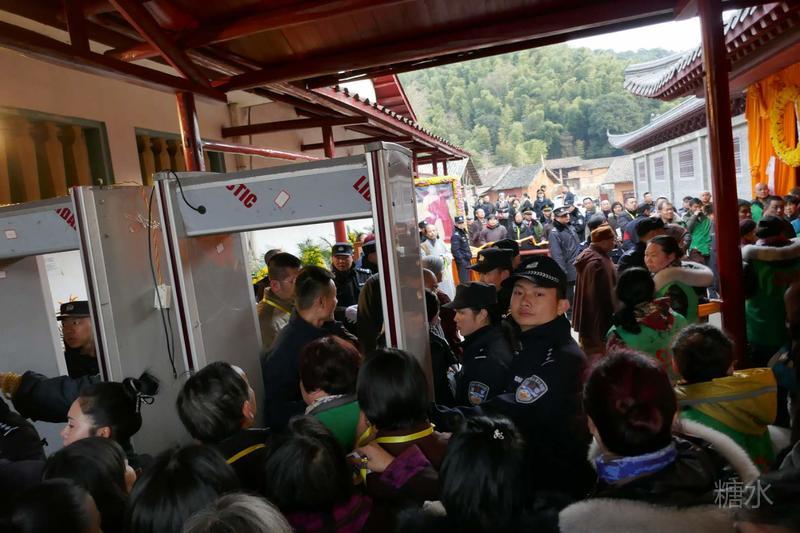 警察把安全检测门布置在入场门口,严格把守法会的安全