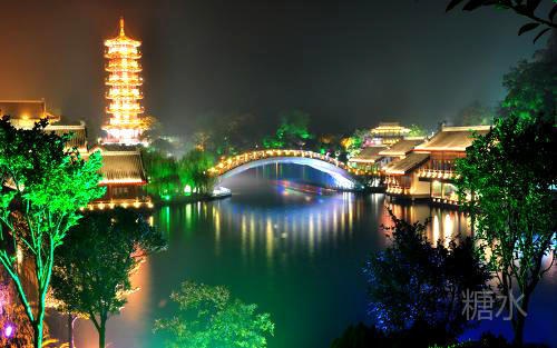 木龙湖这里的建筑古色古香又有民族特色,亭台楼阁参差错落;一座宝塔尖尖七层四面八方,在黄灯和白灯的照射下,熠熠生辉,更让人赏心悦目的是那座清明上河桥,据说是按照《清明上河图》建造的,夜晚打上七彩灯光,不是彩虹胜似彩虹。
