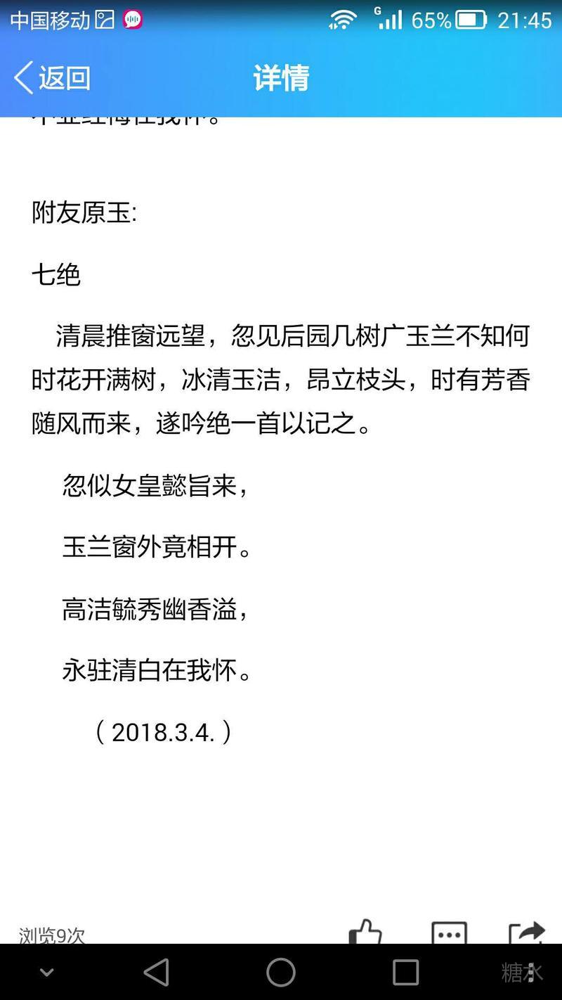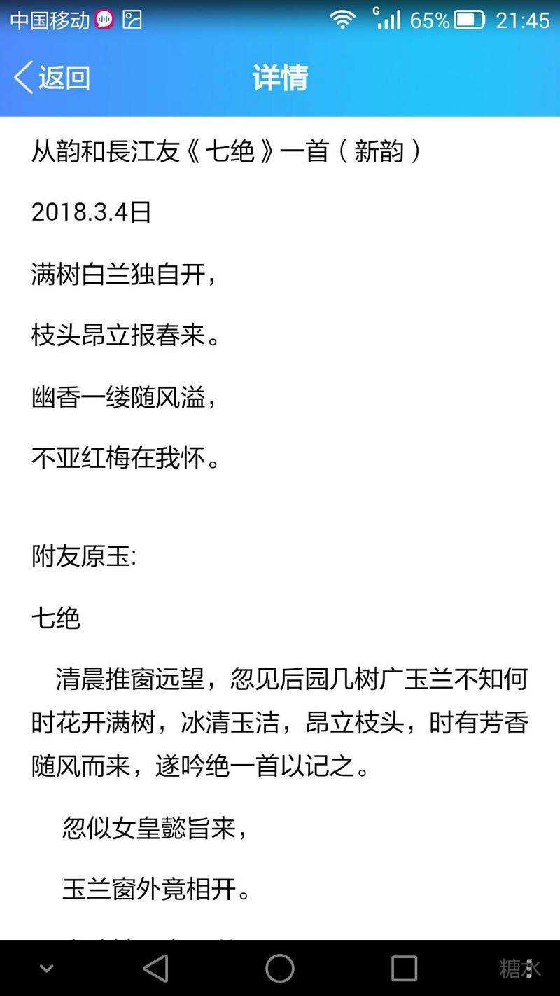 晨练(新韵) 2018.7.10日 管它酷暑与寒冬。 晨练多年从未停。 舞袖甩出身健壮, 霓裳飄逸晚霞红。 新栽昙花(新韵) 2018.7.20日 春分掐叶入盆中, 盛夏神奇新蓓生。 何故匆匆相斗艳? 昙花亦想寄深情。 观友人七律感动而作 七绝 .感动 2018.7.22日 照顾慈萱数月艰, 更衣喂饭病床前。 天公感动神奇现, 负米尝汤今孝贤。 附:友人原玉 七律 贺家母九十三岁华诞 遭难中秋幸再生, 焚香跪拜谢神灵。 尝汤半月何辞苦, 负米经年更殚精。 共叙天伦时有限, 践行孝道乐无穷。 祈天赐母南山寿, 闲逸安康享太平。