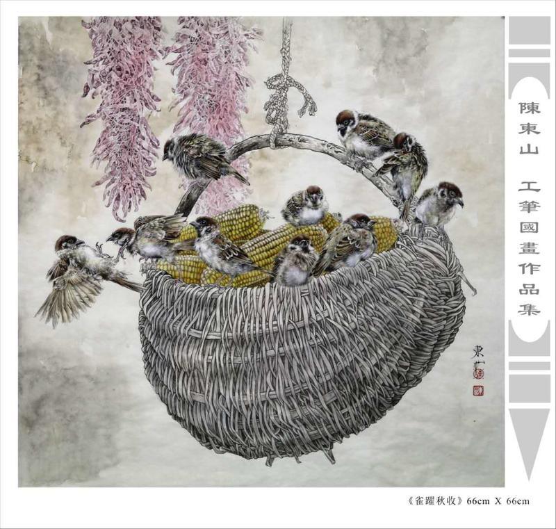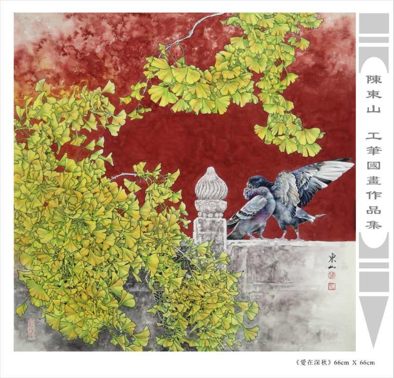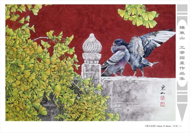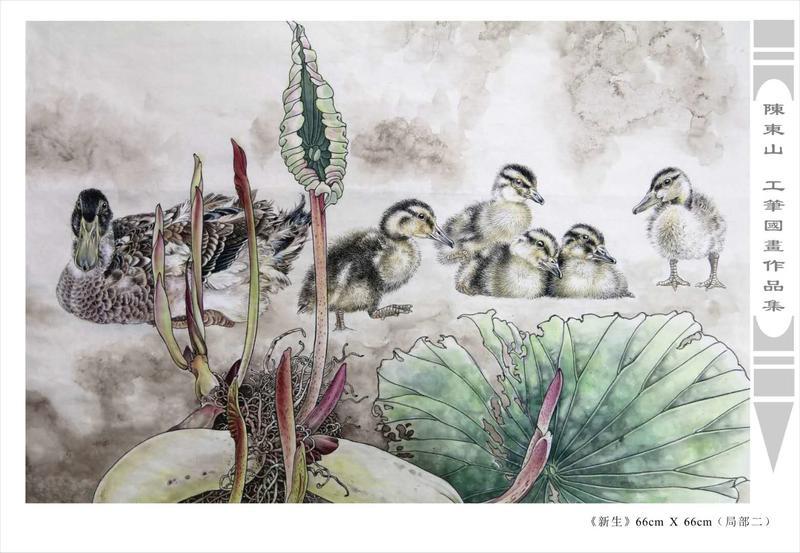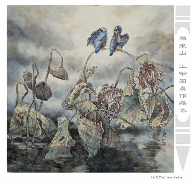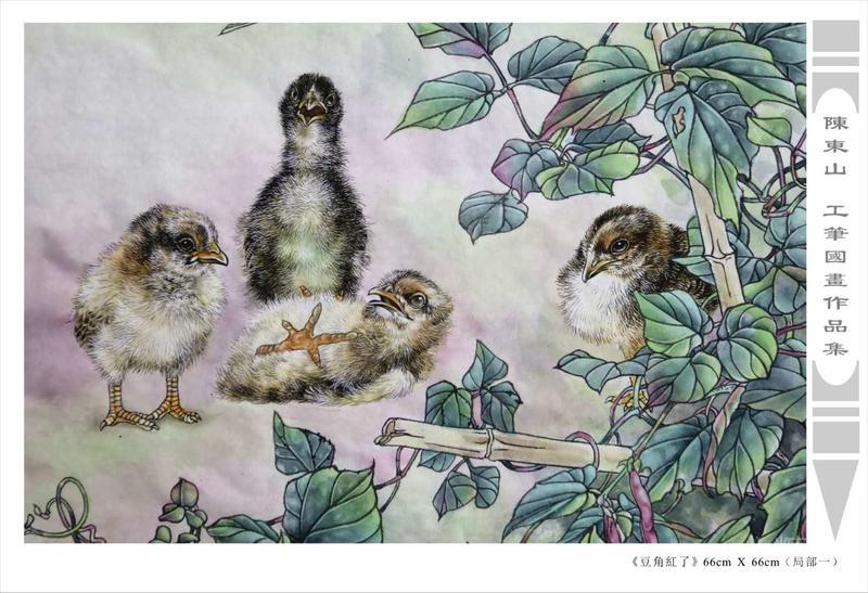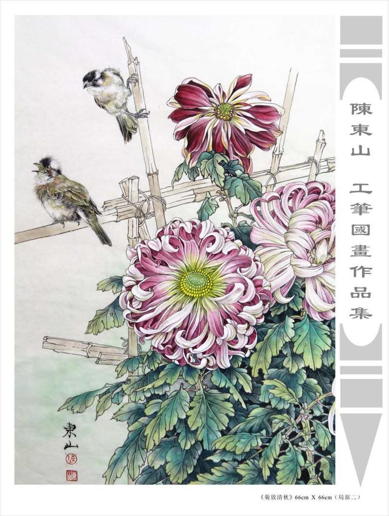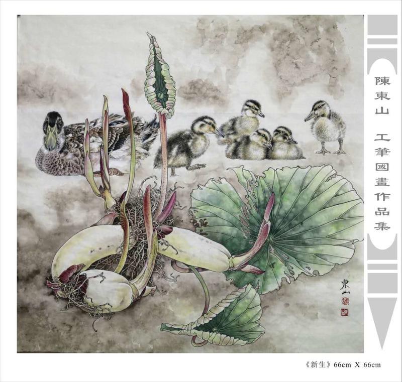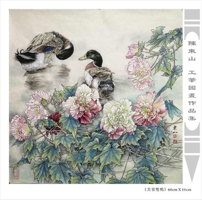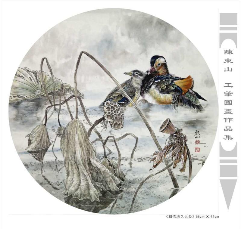 藝術簡歷 陳東山,1961年生於廣東,1980年定居香港, 自幼酷愛繪畫,居港後一直從事中國古代名畫的臨摹和研究工作,經過30多年的探索、磨練。打下堅實的繪畫基礎,終成今日之新風格。陳擅長工筆花鳥,畫風獨特。功力深厚及富有感染力。其作品非常强調物與物之間的相互呼應。雖然只是鵝鴨、雀鴿、蜂蝶又或是竹菊、荷莆、草石,但是在他筆下,每事每物都經過精心的構思,不僅強調其自身的某一特徵,更強調兩者之間在表現瞬間狀態時的整體呼應,因而令他的作品充滿意趣。