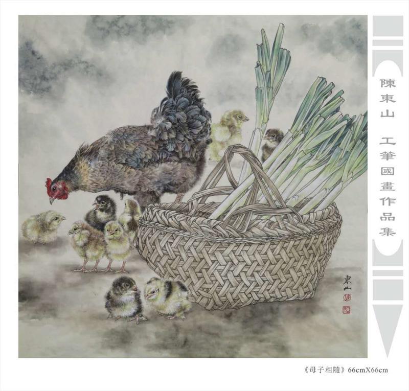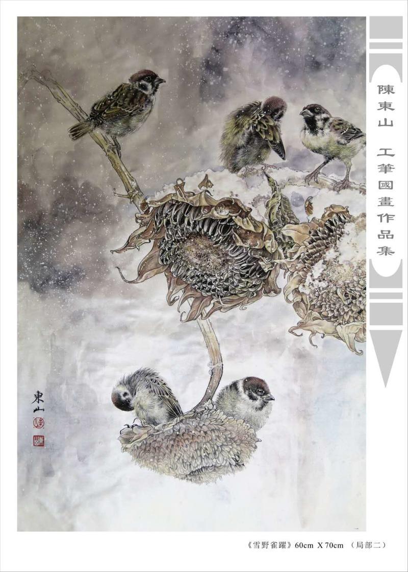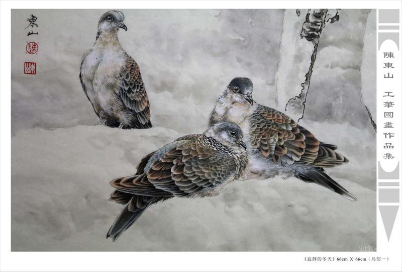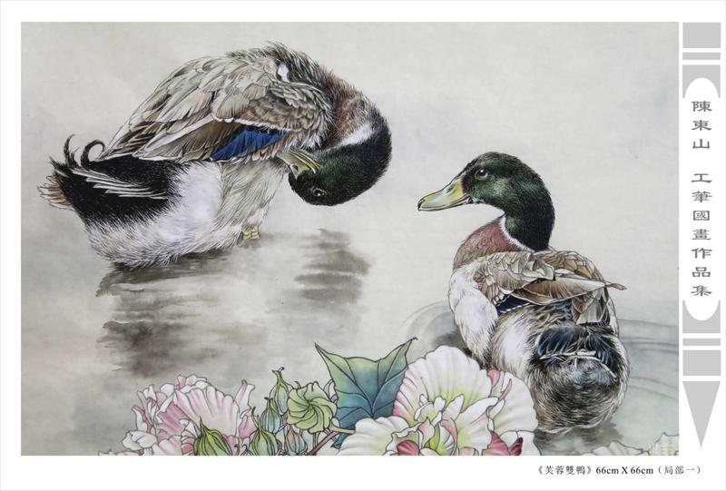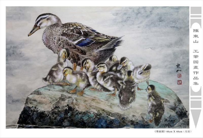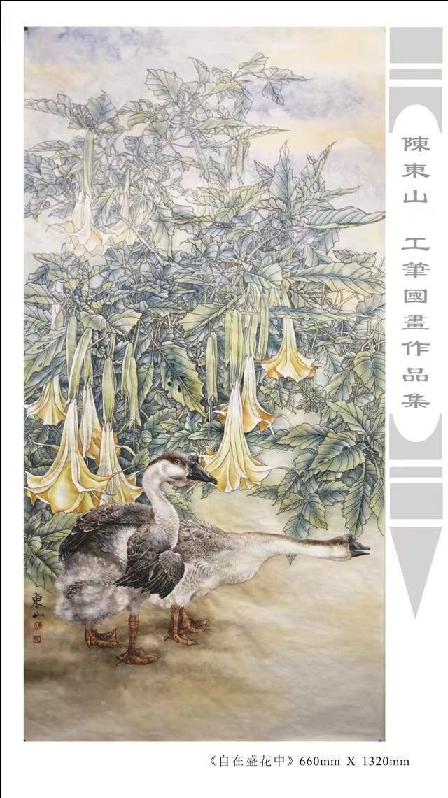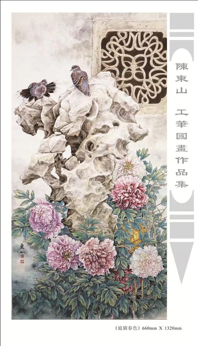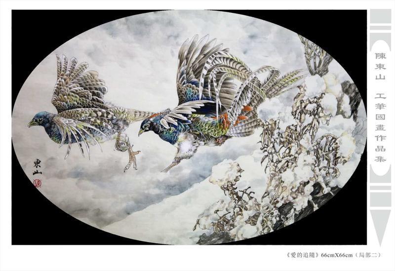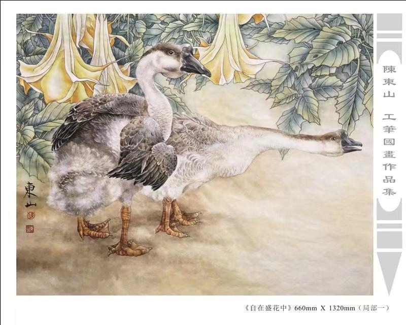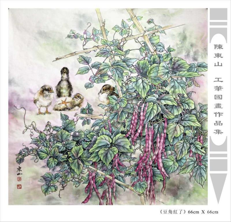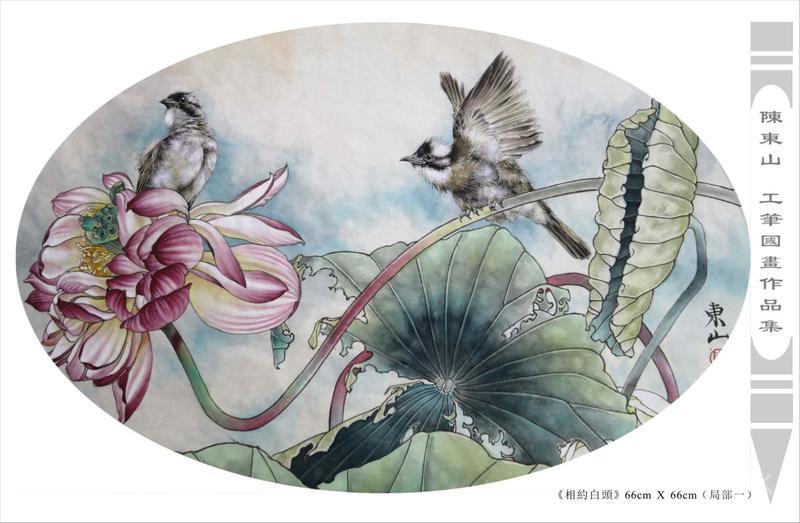 藝術簡歷 陳東山,1961年生於廣東,1980年定居香港, 自幼酷愛繪畫,居港後一直從事中國古代名畫的臨摹和研究工作,經過30多年的探索、磨練。打下堅實的繪畫基礎,終成今日之新風格。陳擅長工筆花鳥,畫風獨特。功力深厚及富有感染力。其作品非常强調物與物之間的相互呼應。雖然只是鵝鴨、雀鴿、蜂蝶又或是竹菊、荷莆、草石,但是在他筆下,每事每物都經過精心的構思,不僅強調其自身的某一特徵,更強調兩者之間在表現瞬間狀態時的整體呼應,因而令他的作品充滿意趣。