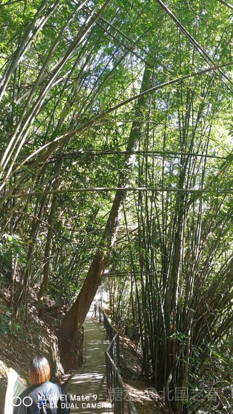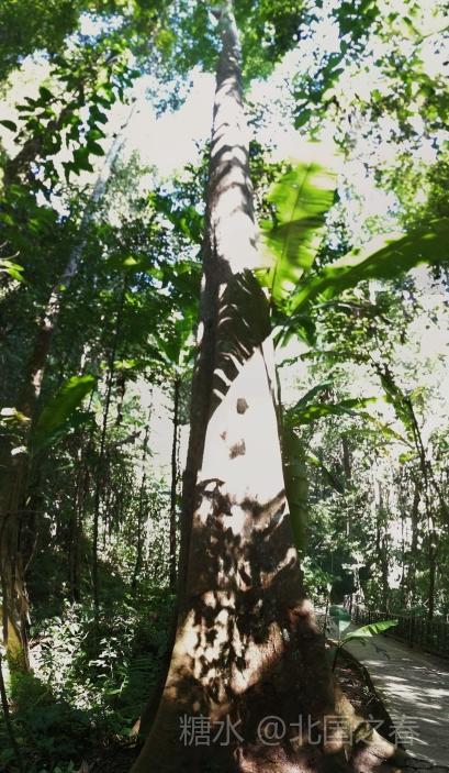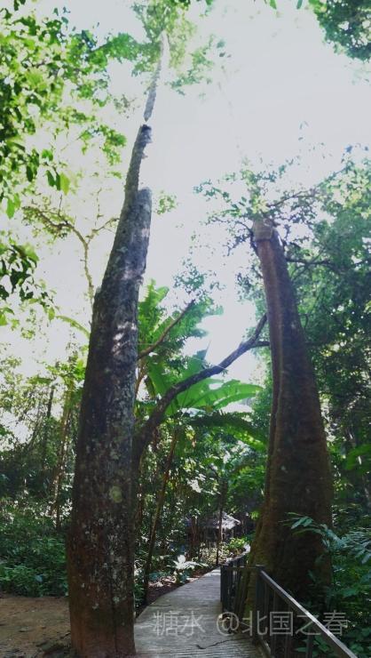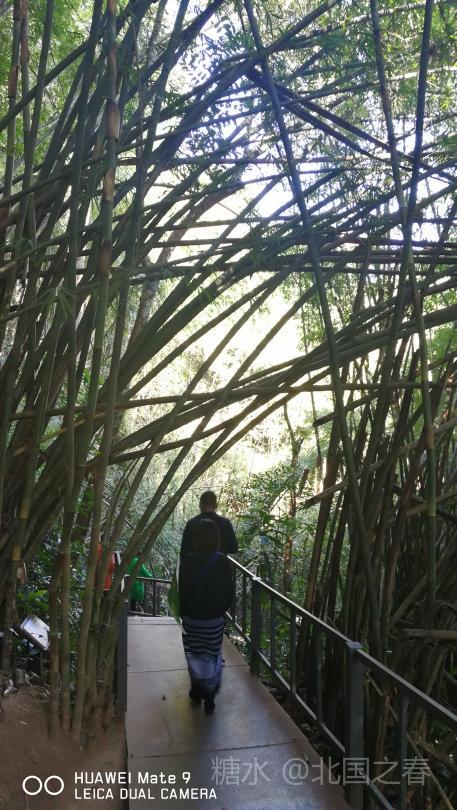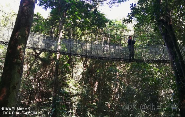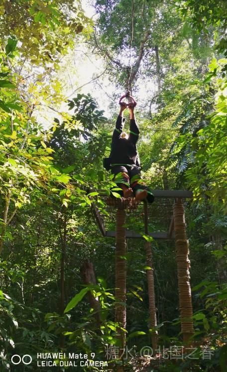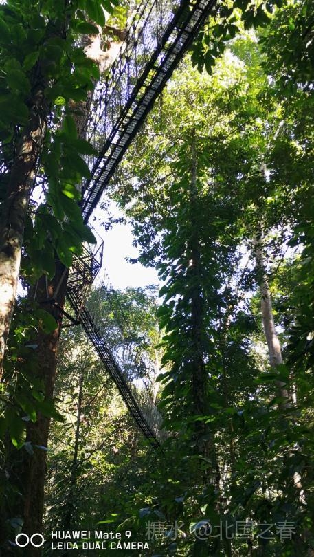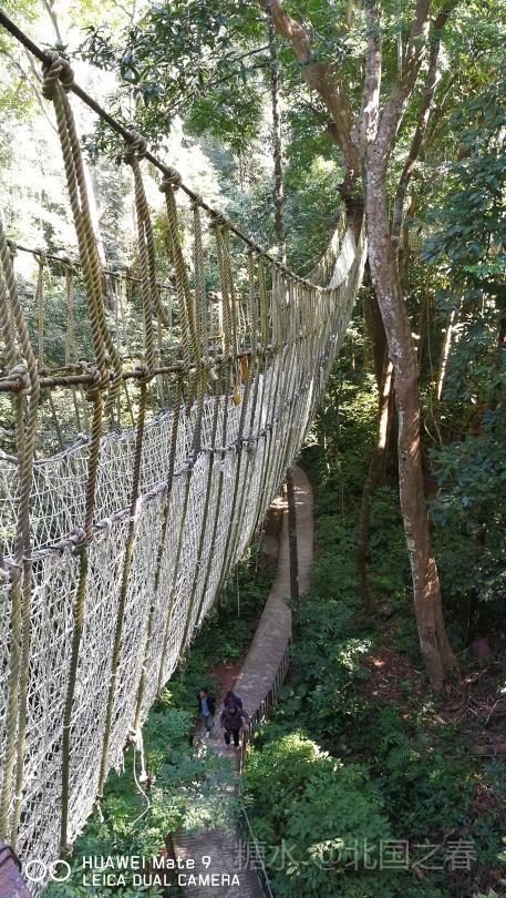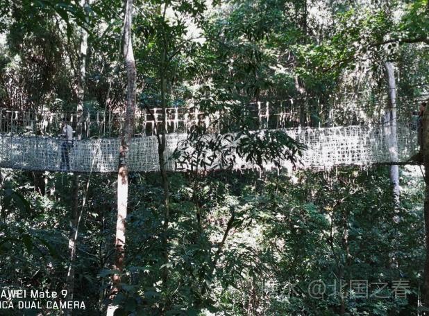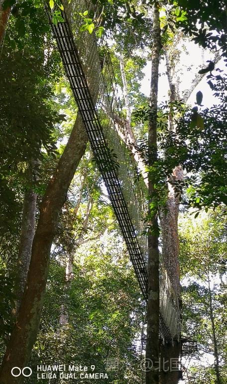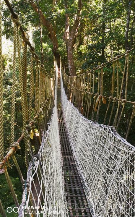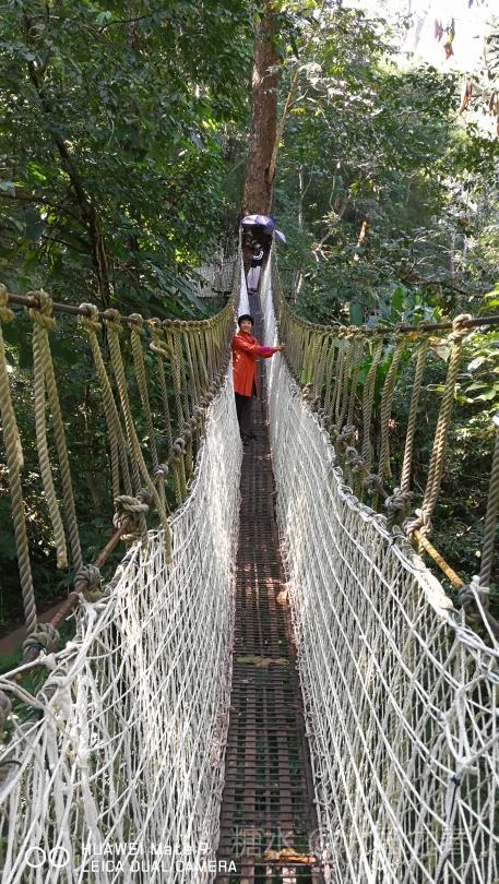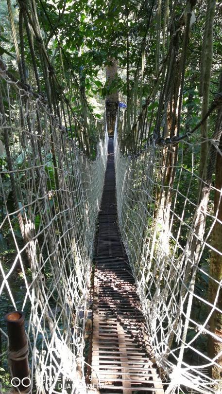热带雨林谷中利用高大树木架起的空中走廊。曲折数段,每段几十米长,二三十米高。走在上面惊险刺激。