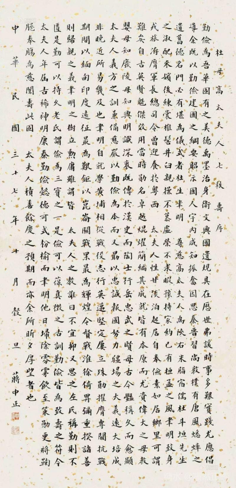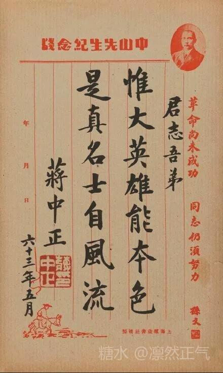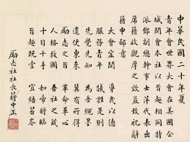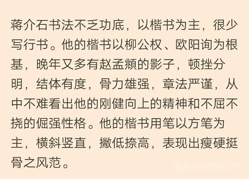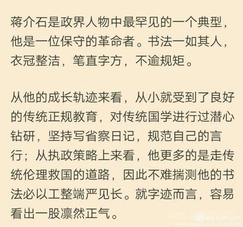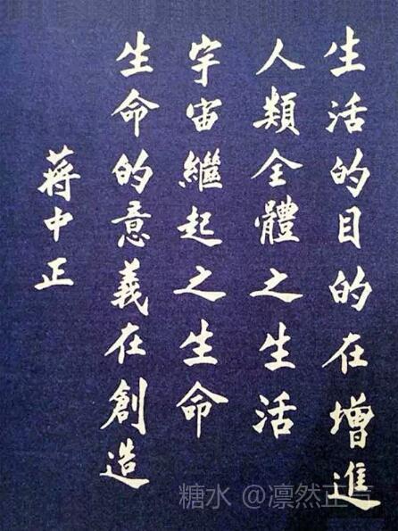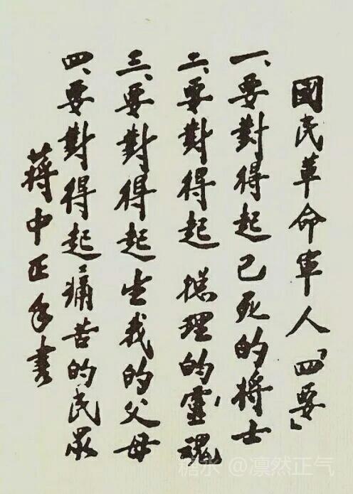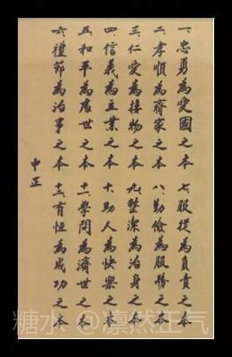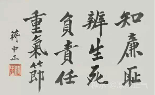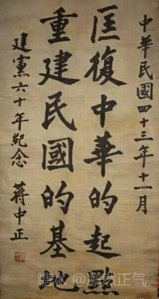 书法是中华民族的精髓,从中华五千年历史以来不断弘扬发展,为此历史重要的是注重书法文化,不在乎谁正面人物或反面人物,尽管蒋介石是代表地主阶级的反面人物,然而他必竞是中國有影响力的人物,历史的功过是非,自有后人评说,避开政治不谈,然而他的书法工整,却是令人赞赏的,制作成篇,重在书法,弘扬中华书法文化,分享于友共赏。 2018/01/29/制作