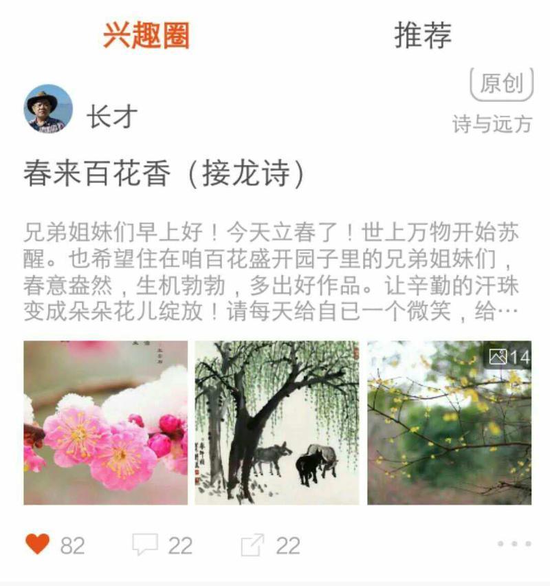 兄弟姐妹们早上好! 今天立春了! 世上万物开始苏醒。 也希望住在咱百花盛开园子里的兄弟姐妹们,春意盎然,生机勃勃,多出好作品。让辛勤的汗珠变成朵朵花儿绽放!请每天给自已一个微笑,给自己一个温暖的拥抱。 当岁月无情的刻出痕迹时,你的微笑会拒绝那把无情的小刀,让它无从下手!你的微笑除了能给自己带来自信,还会给别人送去温暖和快乐! 《春来百花香》是我们群为立春接龙诗命题。希望大家围绕这个题接龙,抒发对春的喜悦!对百花盛开群美好的祝愿!围着这个题意接下去,我知道大家有这个能力会积极接下去的。接的好与不好不要紧,要紧的是积极参与!我们各自的作品都往家里送来给大家分享,也希望大家把这家里的快乐同样一起助兴。 接龙诗限两天后收集,仍由群管长才兄负责辛苦做成格图发表。希望大家一齐努力!