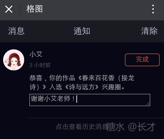 沧海一粟留言 格友老师们大家上午好!在此我代表《百花盛开》群全体群员,向各位老师一直在长才兄为群做的链接格图里,对我们群员作品的支持和鼓励!有您们的支持,使群员们更加有创作的动力!在您们的关注和互相交流下,百花盛开群更觉温暖如春!在这新的一年里,春天已经到来,《百花盛开》群希望得到您们一如既往的关注和支持,让您们的鼓励变为滋润百花的雨露,在您们的浇灌下,《百花盛开》群继续生机勃勃!和您们携手共进在格图的路上。诚祝各位老师幸福安康!吉祥如意!双手合十! 特敬告:如有老师愿在(春来百花香)的接龙里,留下您的接龙诗,墨宝将由群管长才兄负责收集,进入我们的接龙诗作品里。希望大家展现您的美诗,让我们一起分享您心中的惬意! 沧海一粟敬留! : (2018年2月5日)
