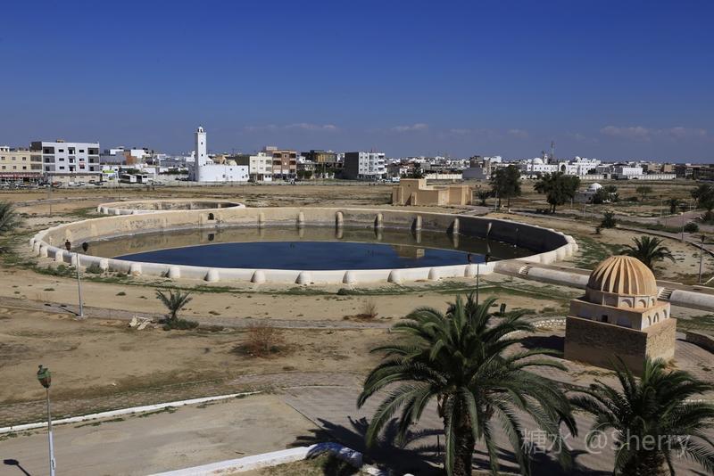 “阿格拉比特蓄水池—古人千年智慧的结晶 公元九世纪,由于当时凯鲁万地区缺水严重。天旱少雨,加之该地区又处于海平面之下,用水极其困难。当地人修了15个蓄水池用于解决饮水问题。现有被称作阿格拉比特水池的一大一小两个水池供游人参观。水用渡槽由远处引来,先进入小水池沉淀,然后进入大水池供使用。大水池直径128米,深5米,可容水6.28万立方米。”
