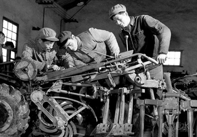 图为农机厂工人在为生产大队的手扶耕耘机安装深耕犂。