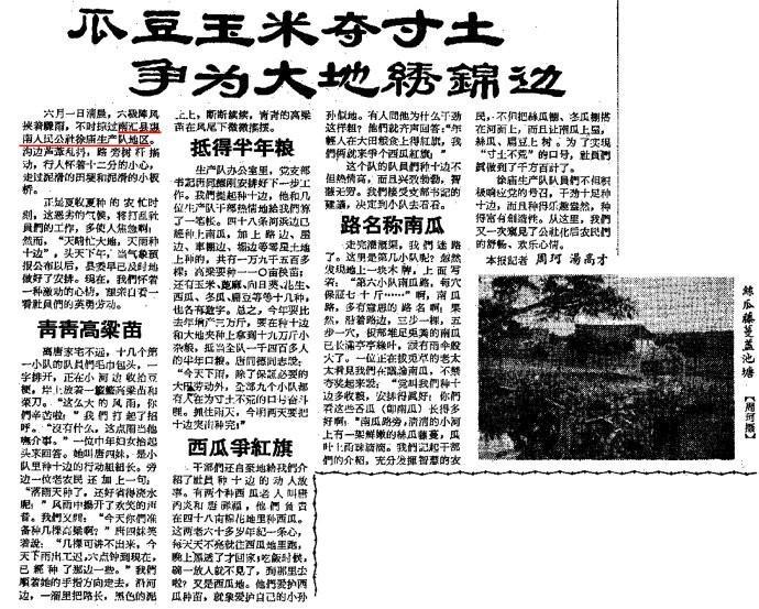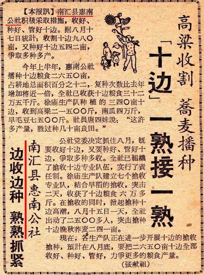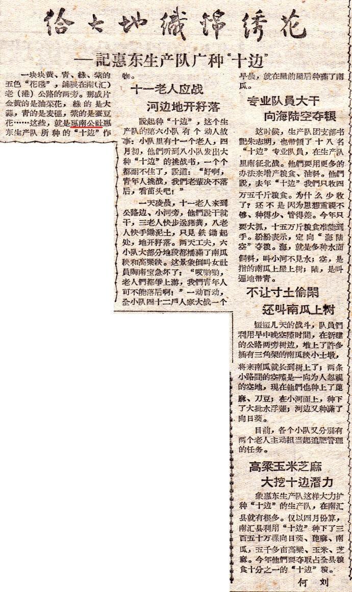 选自1960年4月25日《新民晚报》 新华社1960年4月26日报道:惠南公社人民生产队积极发展多种经营.上海市南汇县惠南公社人民生产队,在紧抓春季生产的同时,突击广种“十边”,多方面发展副业,力争农业生产全面丰收。人民生产队1960年利用空地第一次种了10多亩药材——“生地”,长得很好。