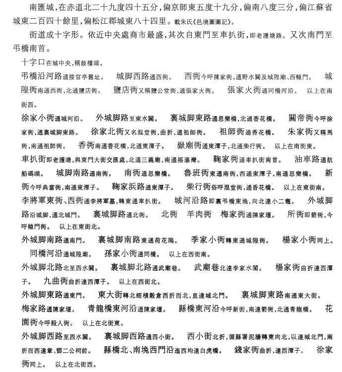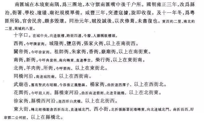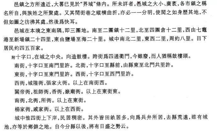图为光绪五年《光绪南汇县志》对县城及街巷的介绍 光绪八年(1882年)南汇实行保、甲制,南汇县划十区,惠南地区西部承属一区,东部属三团。 民国元年,商汇县实行地方自治。惠南地区大部属城东、城西两乡。县治改为城厢镇
