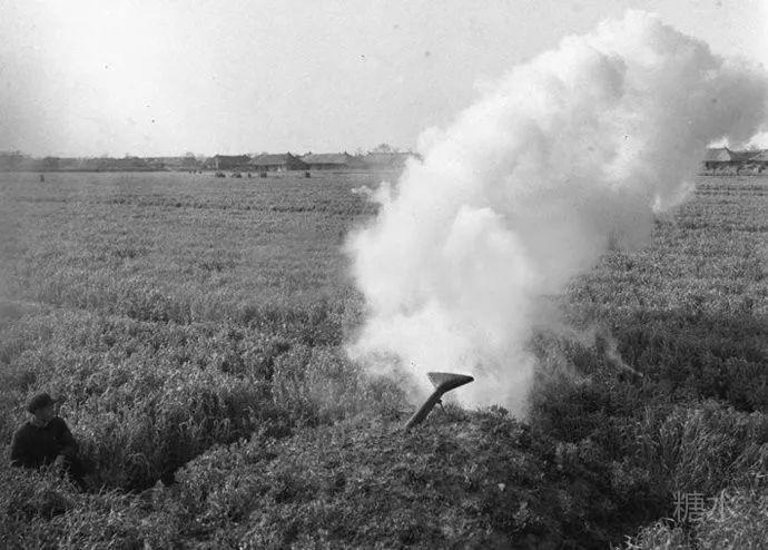 图为惠南人民公社惠东生产队用“火炮喷粉器”,在大片的小麦田里喷射“六六六”粉,防治虫害。这种“火炮喷粉器”一炮能喷六-八分地的农药,喷得又均匀,一个人一天能喷药治虫50多亩。
