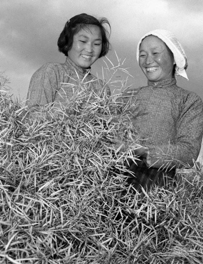图为油菜专业队队员朱珊(右)和邬桂仙,喜看丰收的油菜。