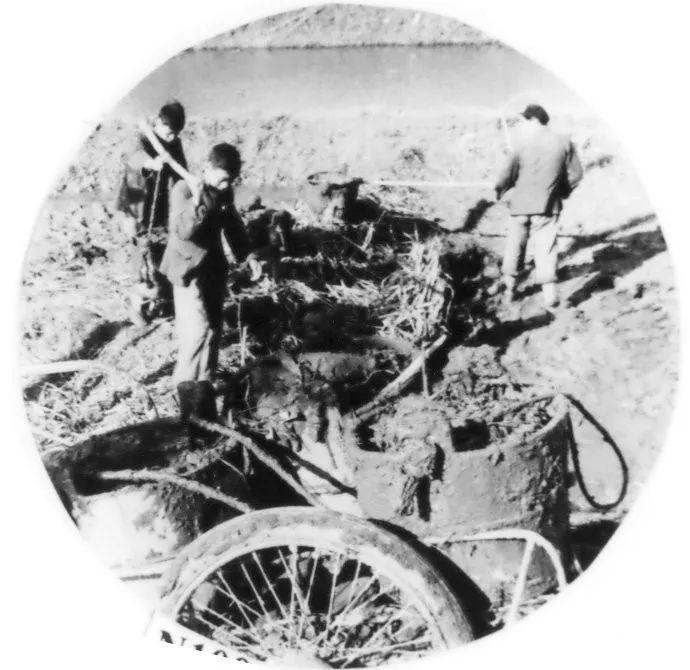 图为南汇县惠南公社生产队的社员们在挖河泥.
