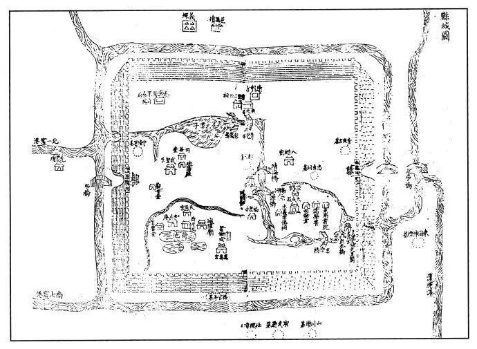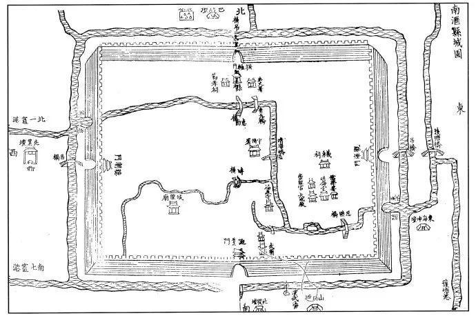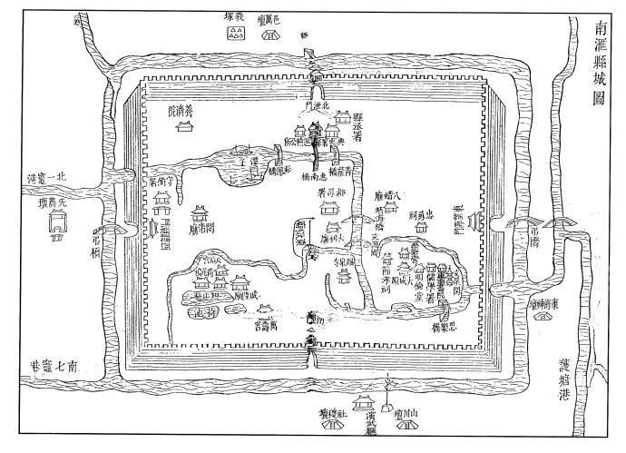 图为雍正九年县城地图(选自雍正九年《雍正分建南汇县志》)