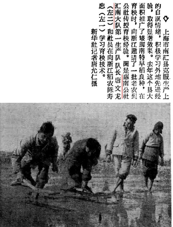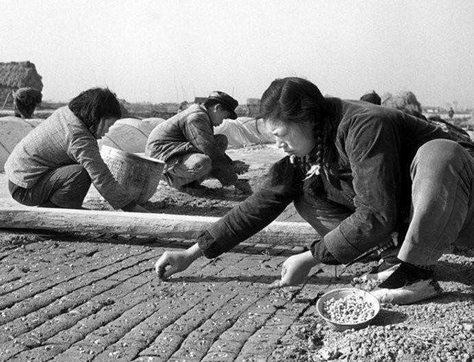 选自1965年2月22日《新民晚报》 新华社1965年3月25日报道:上海市南汇县惠南人民公社西门生产大队第七生产队的干部王梅仙(右),同社员一起播种棉籽育苗,加强对棉花生产的领导。