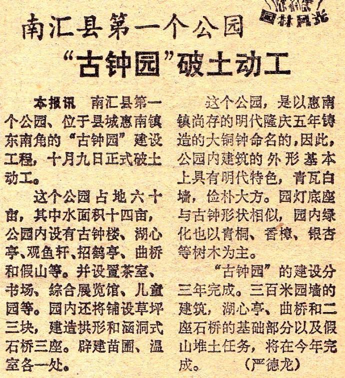 选自1982年8月23日《文汇报》 1982年10月9日,南汇县第一个公园“古钟园”在惠南镇破土动工。