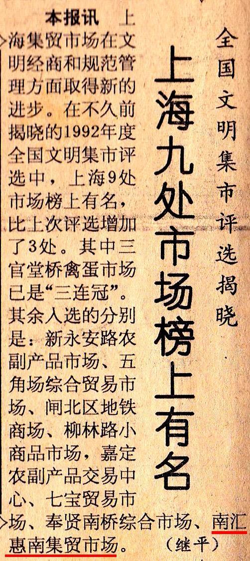 1993年,惠南镇集贸市场被评为全国文明集市。
