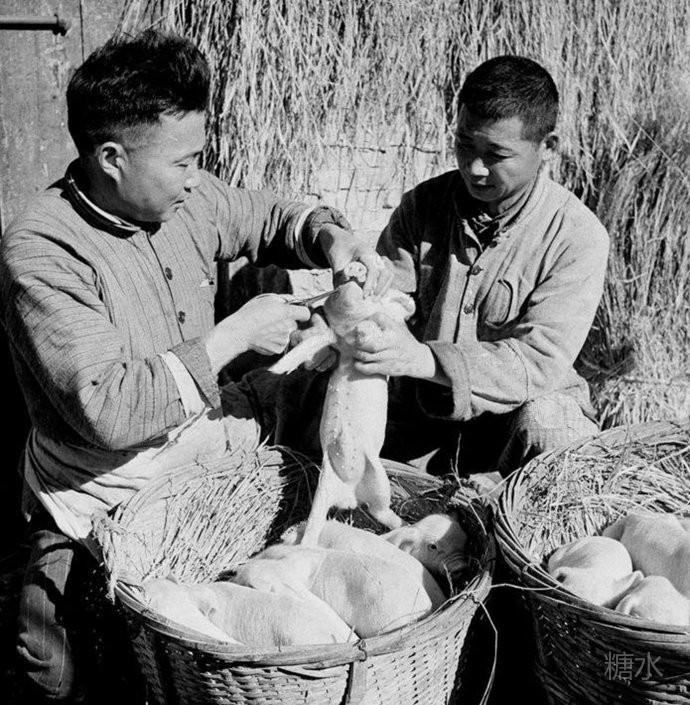 图为副队长朱野根亲自参加饲养工作后,发现了母猪奶头被小猪咬破和小猪互相咬伤的现象,便和饲养员研究用剪平小猪腔牙的办法来加以解决。这是朱野根(左)在替小猪剪腔牙 新华社1960年3月31日报道:上海市南汇县惠南人民公社,试制“火炮喷粉器”治虫工具成功。在试制过程中,由于积极采取边实用、边改进的措施,现已制造出一种结构简单、效果很好的火炮喷粉器。