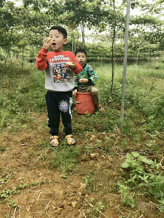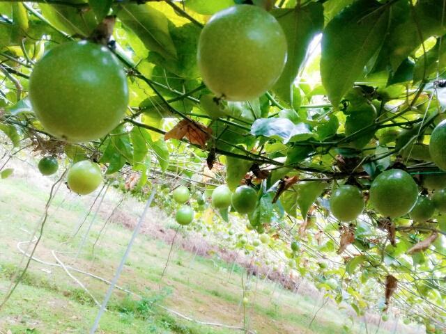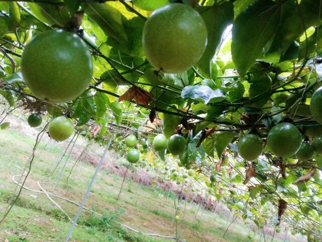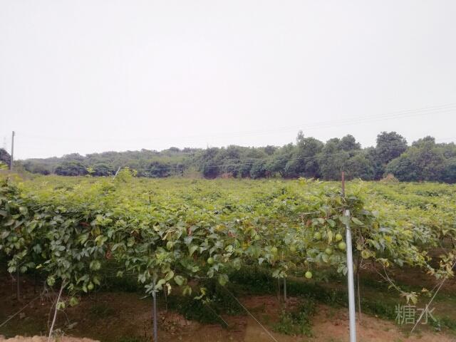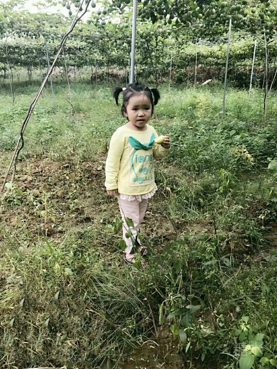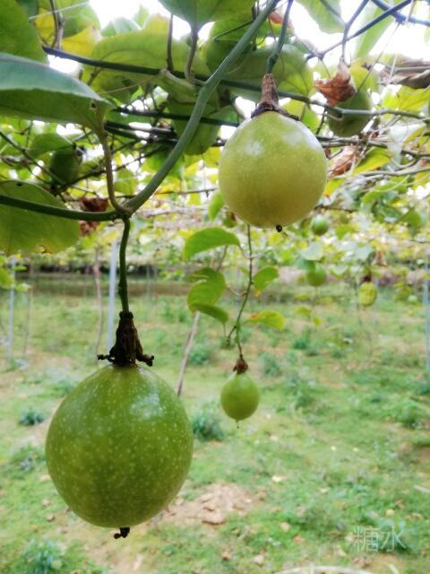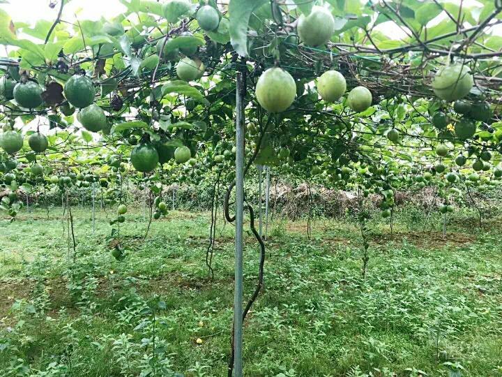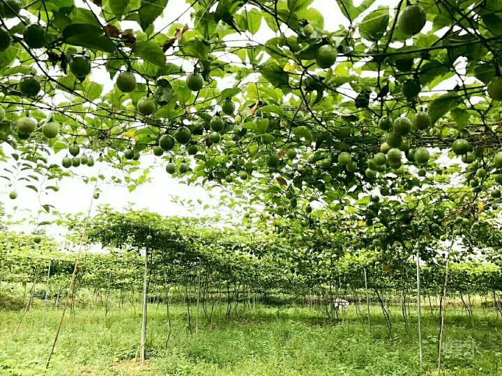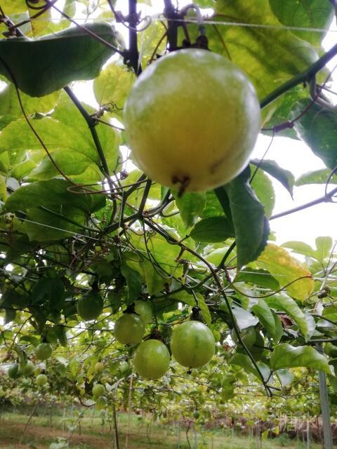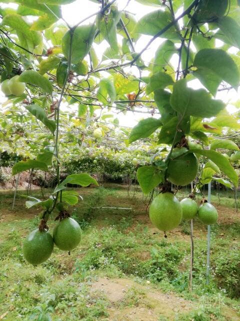 鸟语花香的青山绿水,惬意升华。 我们一进黄金百香果园,一排排架上的绿藤枝,挂着黄黄绿绿圆果实,密密麻麻,望不尽头,一大林丰收的景象。 风阵阵,赴来浓郁百香果味,这浓,鼻子一捒,肚子竟"咕噜"了。