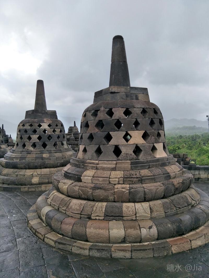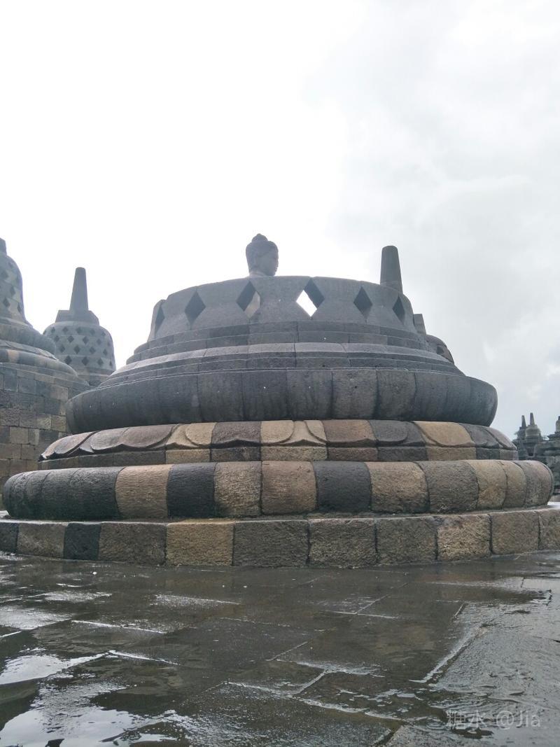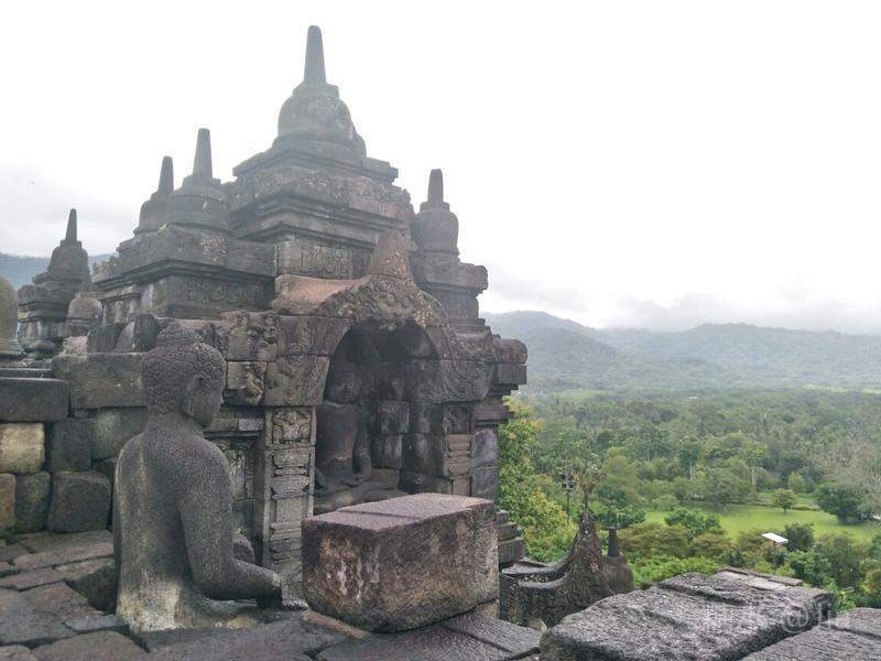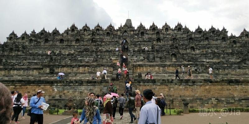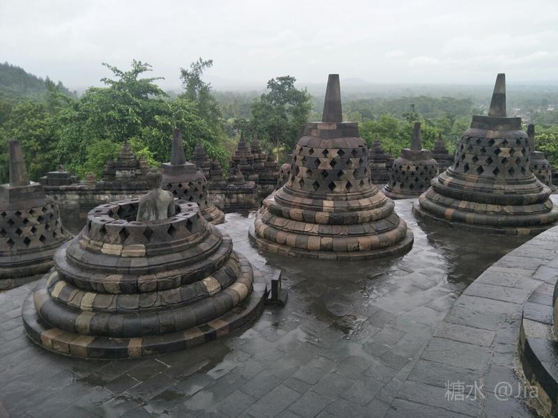 很多游客来此都陪伴庄严的佛塔看日出,我们因不愿清晨3时多起床而无缘美景。等我们下午1时左右来朝圣,老天竟在2个多小时的时间里向我们头上泼了几场大雨作为惩罚,算是领教印尼的雨季了😜。