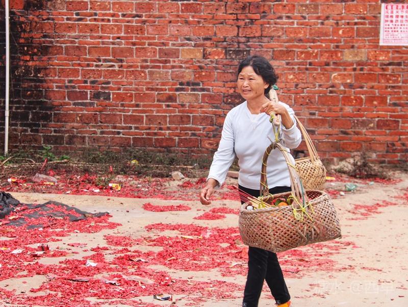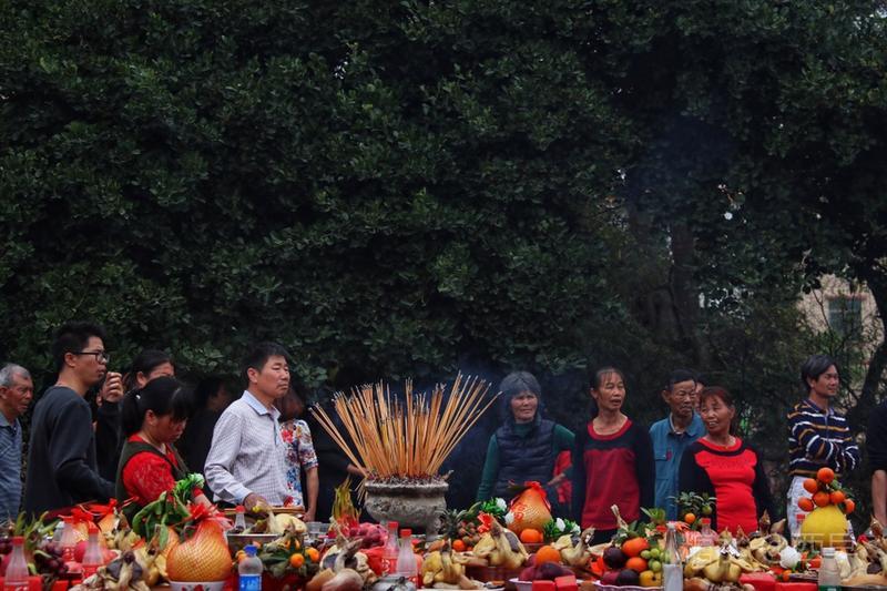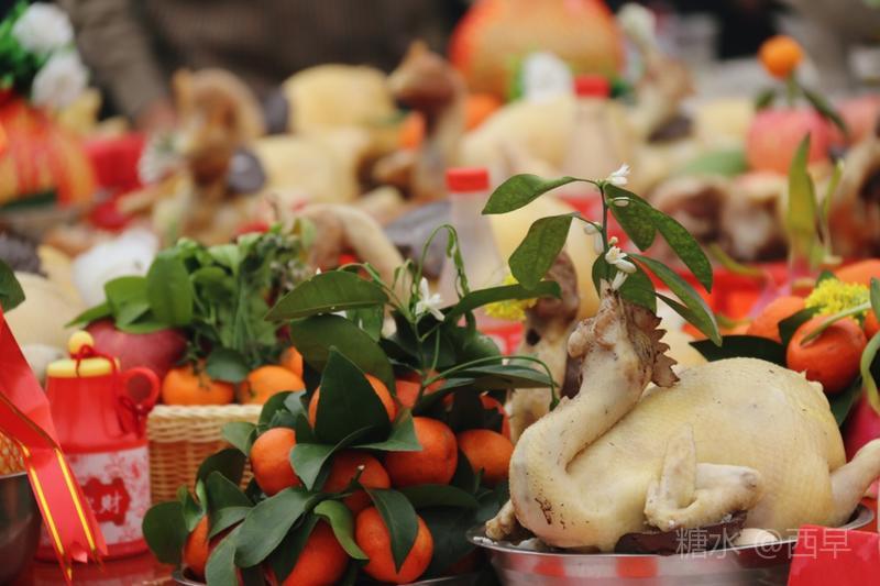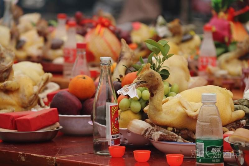 经过挑选取和煮制的一只只鸡,胖鼓鼓、油汪汪,脖子挺起一个弯,显得雄赳赳的。鸡的嘴里总要衔着一个利事袋(相当钱袋),是准备接纳神的恩赐的。鸡头都朝向一个方向——神将要莅临的方向。除了鸡以外,酒、肉、鱼、水果等一切人们在节日里享用的东西,都要拿来给神歆享。