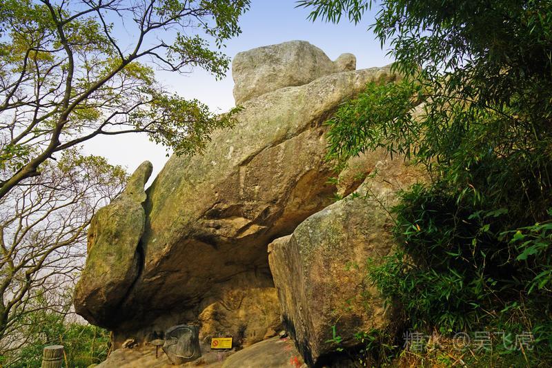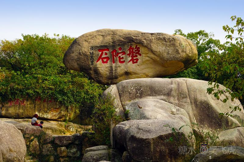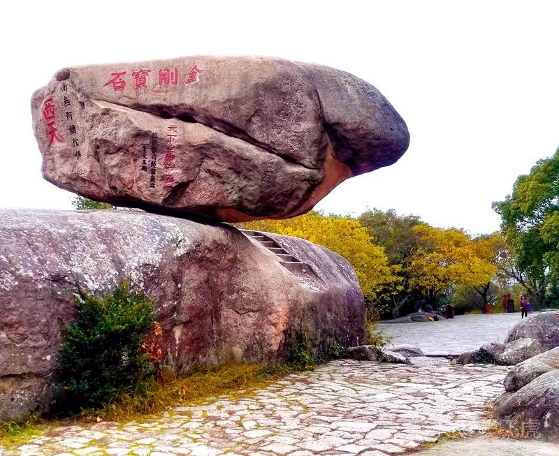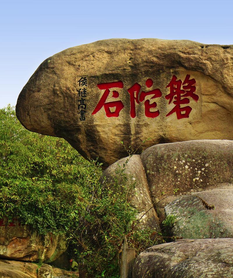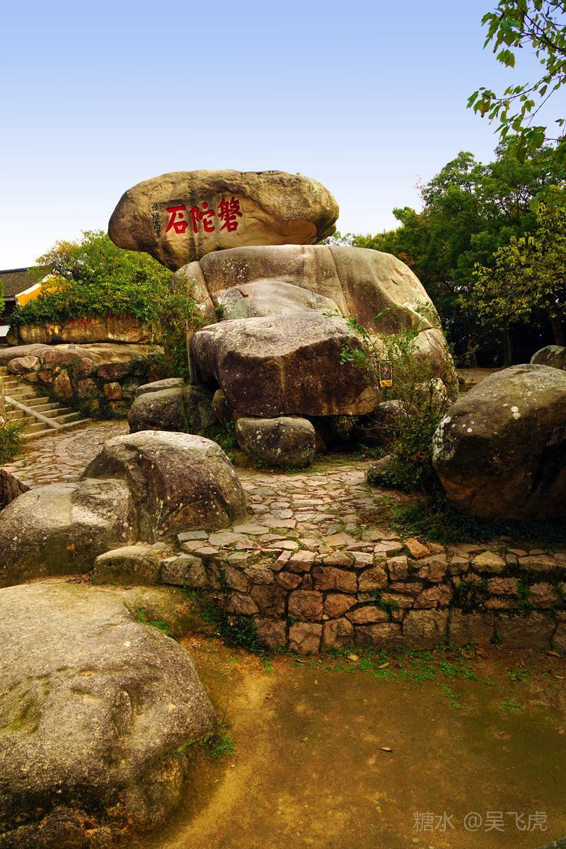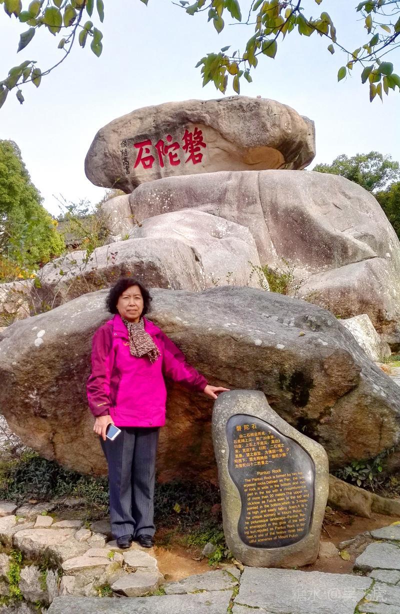 由梅福庵西行,不远便见磐陀石.磐陀石由上下两快巨石相叠而成,上石上广下锐,高达3米,宽近7米,顶巅平坦,可容三十人左右,拾级而上,以观沧海,视野宽阔.下石周广大20余米,将上石托住.两石间隙如线,睨之通明,似无着处.相传有人曾牵线横割而过,以后试者皆无成功.磐陀石险如滚卵,却安稳如磐,亿载未动,万劫不摇,为普陀胜境之绝.石上题有"磐陀石"、"金刚宝石"、"天下第一石"、"通灵"等字."磐陀石"三字系明代抗倭名将侯继高所书.