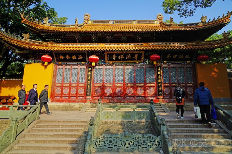 普济寺又称前寺,是普陀山供奉观音菩萨的主刹,始建于北宋。普济寺规模宏大,建筑雄伟,有殿宇九座,其中大圆通殿是寺之正殿,殿正中塑观音像,高约九米,两旁塑观音32应身像,展现观音在十方世界以不同身份出现各种形象。莲花池东面的多宝塔是普陀山现有最古老的建筑(建于元代元统年间)。多宝塔与"普陀鹅耳枥"号"杨枝观音碑"合称普陀三宝。