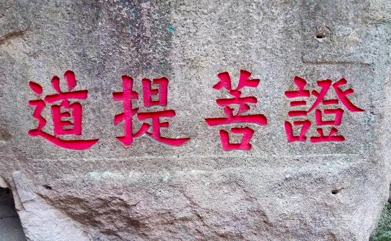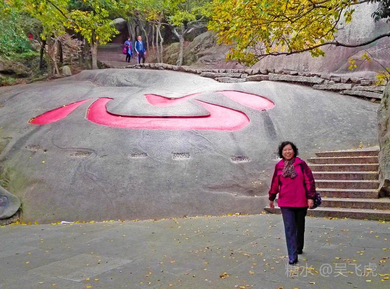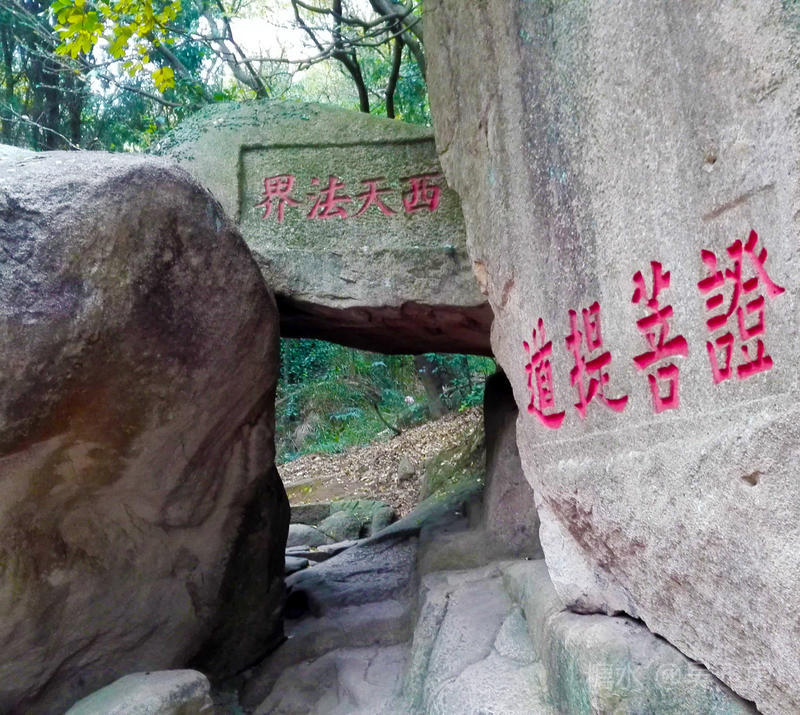西天门下西南方向有一巨石,广约300米,圆浑平滑,中间刻一巨大的"心"字,足有5米高、7米高,“心”字的中心一点可坐八九人,整个字可容百人打坐,是普陀山上最大的石刻文字。此字刻于何年、出于何人手迹无从查考,但至少清代以前就已有此石刻。佛家以修心为上,如今,人们虽不从这个意义上去理解“心”字,但众多青年男女到此游览,都喜欢绕着“心”字环行一周,或在“心”字中间摄影留念,以作爱情和友谊的象征。