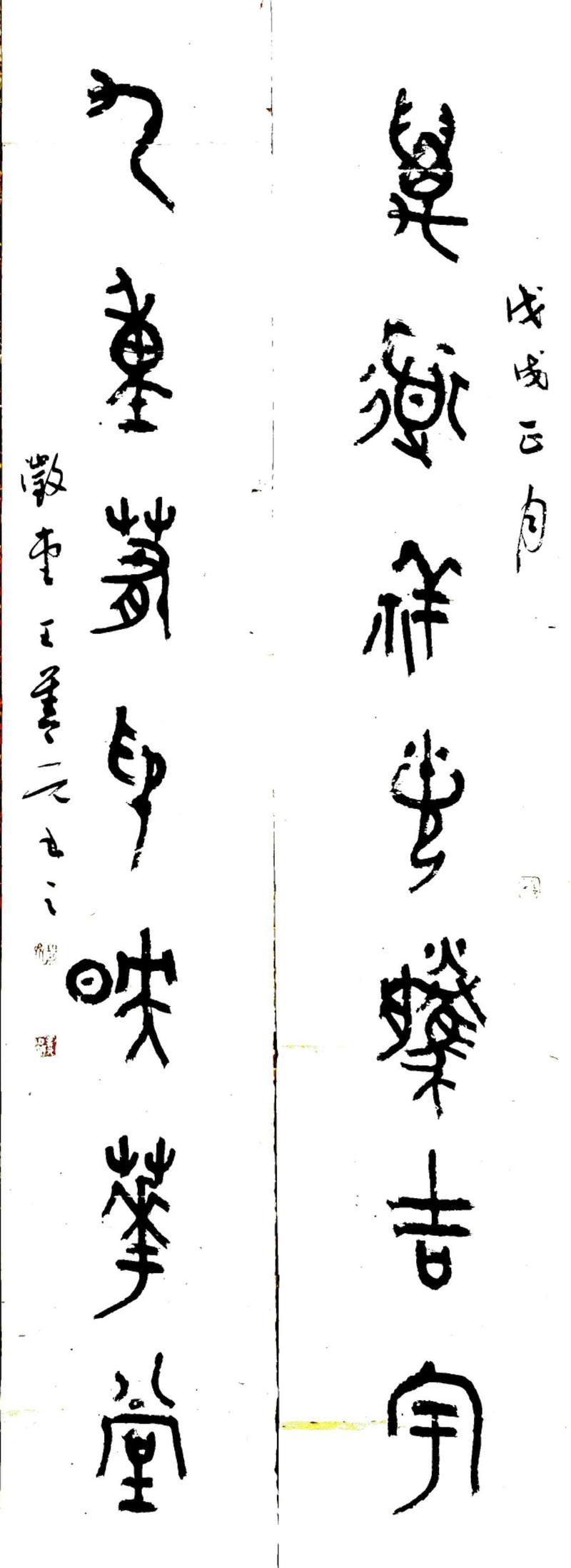 他在深挖传统的艺术形式和规律的同时,十分注重艺术研探的持续性,并通过这种持久的坚持和磨砺来实现对传统的理解应用。近年来,他在坚持以历代诗文名篇为主题创作出系列组印以外,还坚持以大篆的形式每天创作一幅古今佳联,心摹手追,沉浸其中,至今已创作出大篆对联近700幅,拟于年底精选300幅结集出版《王善元篆书三百联》。其中有许多极富文化内蕴的联句及篆法,已成为业界人士追捧的“工具书”和“活字典”,备受欢迎和青睐。其精勤忘我的精神,令诸多同仁自叹弗如,敬佩之至。