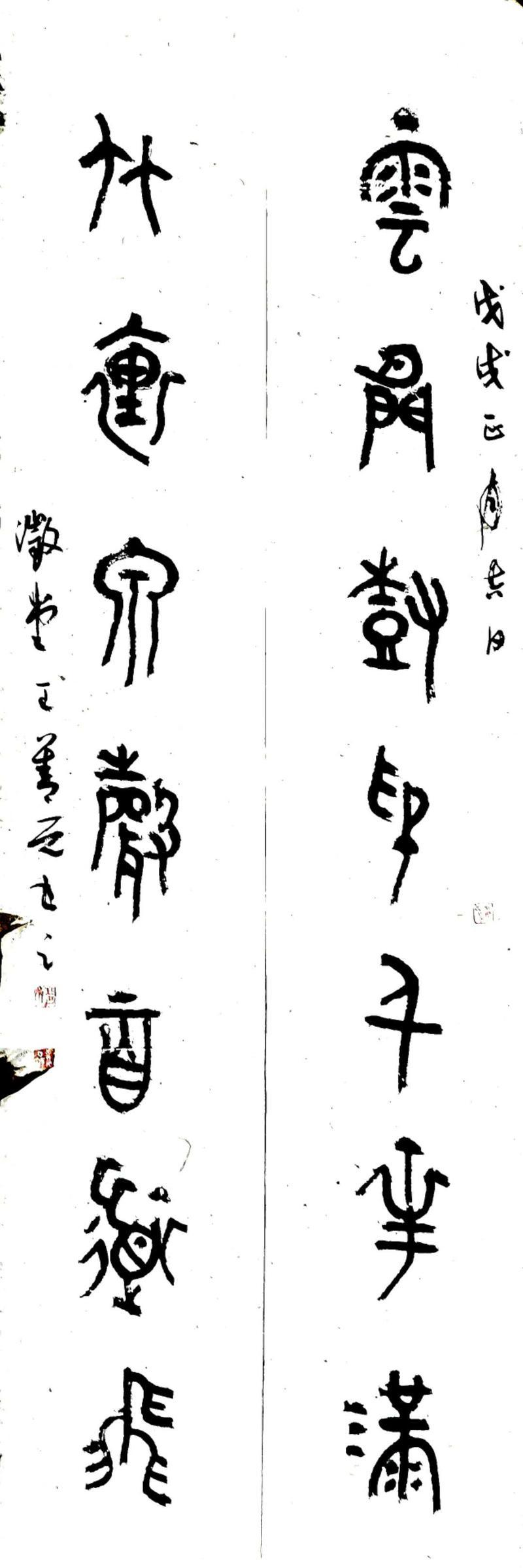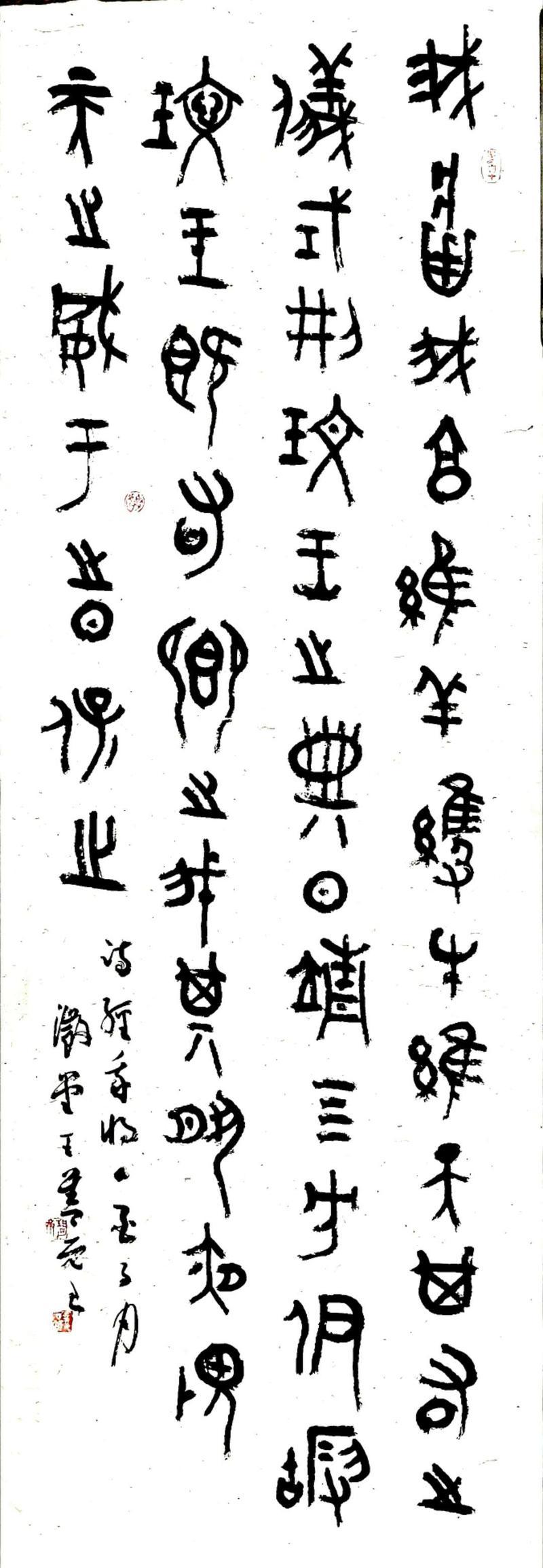 我和善元兄既是好友,也是战友。他自幼酷爱书法篆刻艺术。其父善书,饮誉乡里,自幼受父亲启蒙熏染良多。上世纪80年代,善元兄携笔从戎。尽管当时国内艺术思潮风起云涌,但他始终保持冷静头脑,不随波逐流,坚守自我,把艺术的触角深钻到中国传统文化中去。他甘于寂寞,放弃常人的休闲娱乐,埋首于故纸、残碑、拓片里,从秦砖汉瓦、金文陶文石刻,诸如《毛公鼎》《散氏盘》《虢季子白盘》《石鼓文》等经典中汲取艺术营养,通过购买、借阅大量碑帖,由当代到近代,由明清到秦汉再到先秦,对汉字生发、演变的轨迹和书写、镌刻风格的流变,追根溯源,作了较为深入系统的研究和认识。尤其是在安阳工作的四年期间,接触了大量的甲骨片和拓片,艺术视野更加开阔。与此同时,他注重书刻并修、临创兼习,在临摹写刻中,对秦汉古玺、甲骨文等篆法刀法及章法深加探索体会,并旁涉古今书论,不断强化艺术修养。