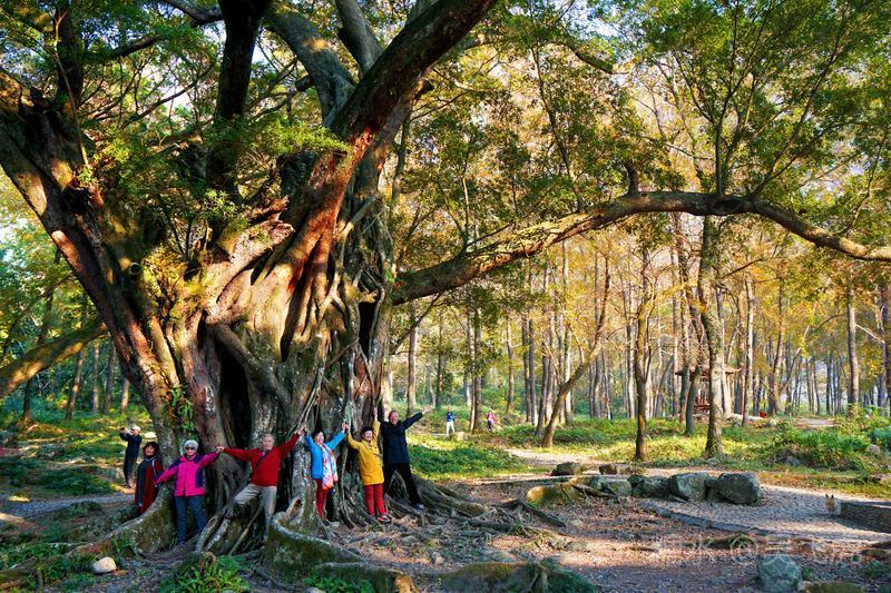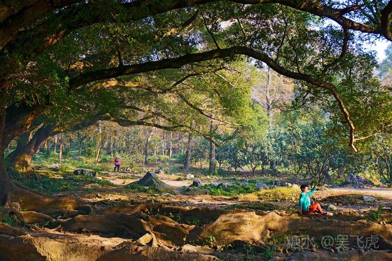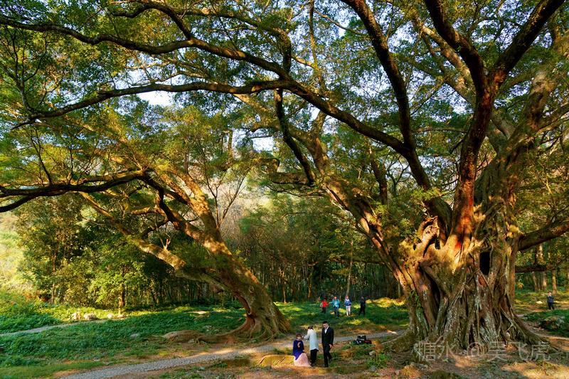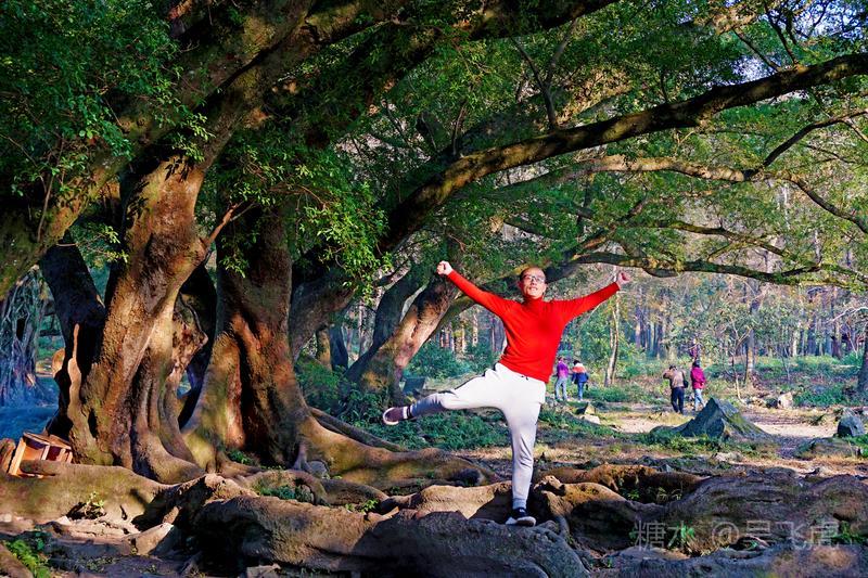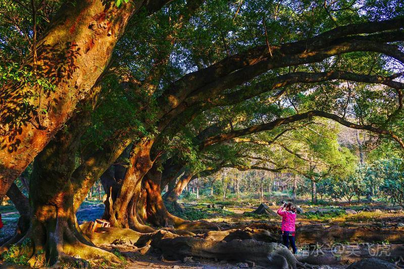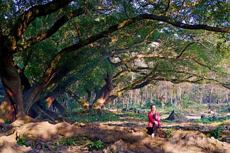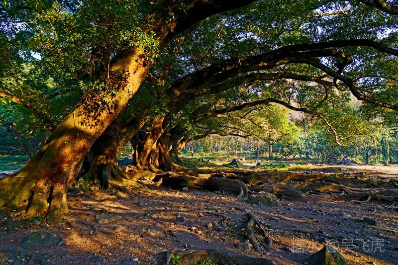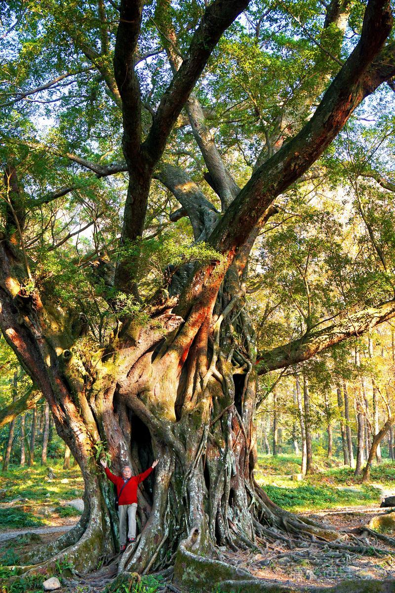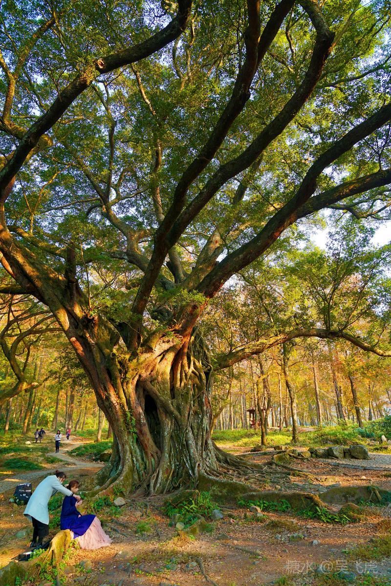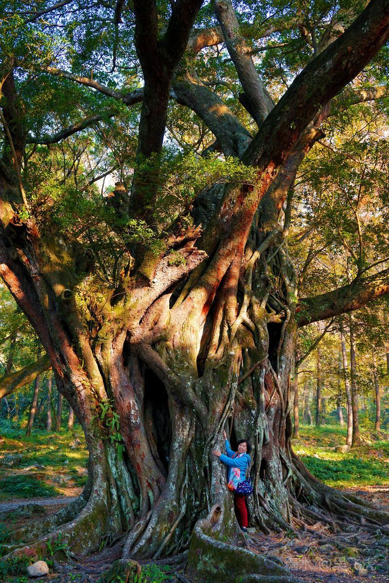 其中最值得一提的是一株“榕树王”,它的树龄已有800多年,树干周长12.6米,冠幅直径51米,高30米。当阳光斜斜地洒进树林,斑驳的树影在光影的晃动下展示着它的魔法,营造了一种如梦似幻的感觉。