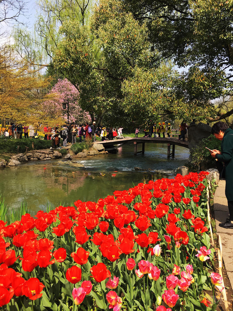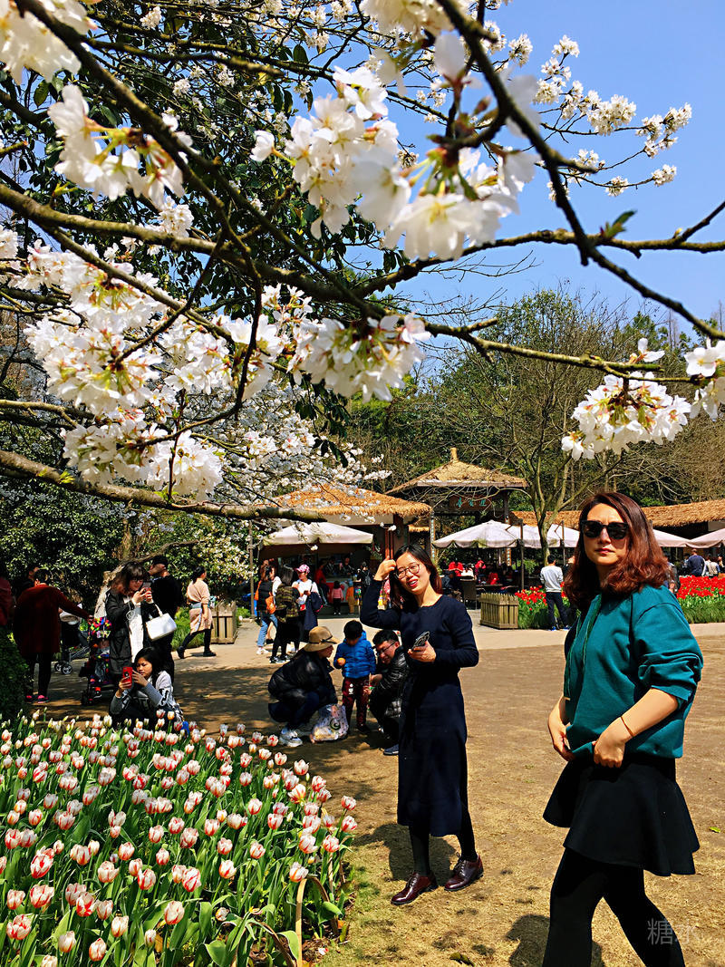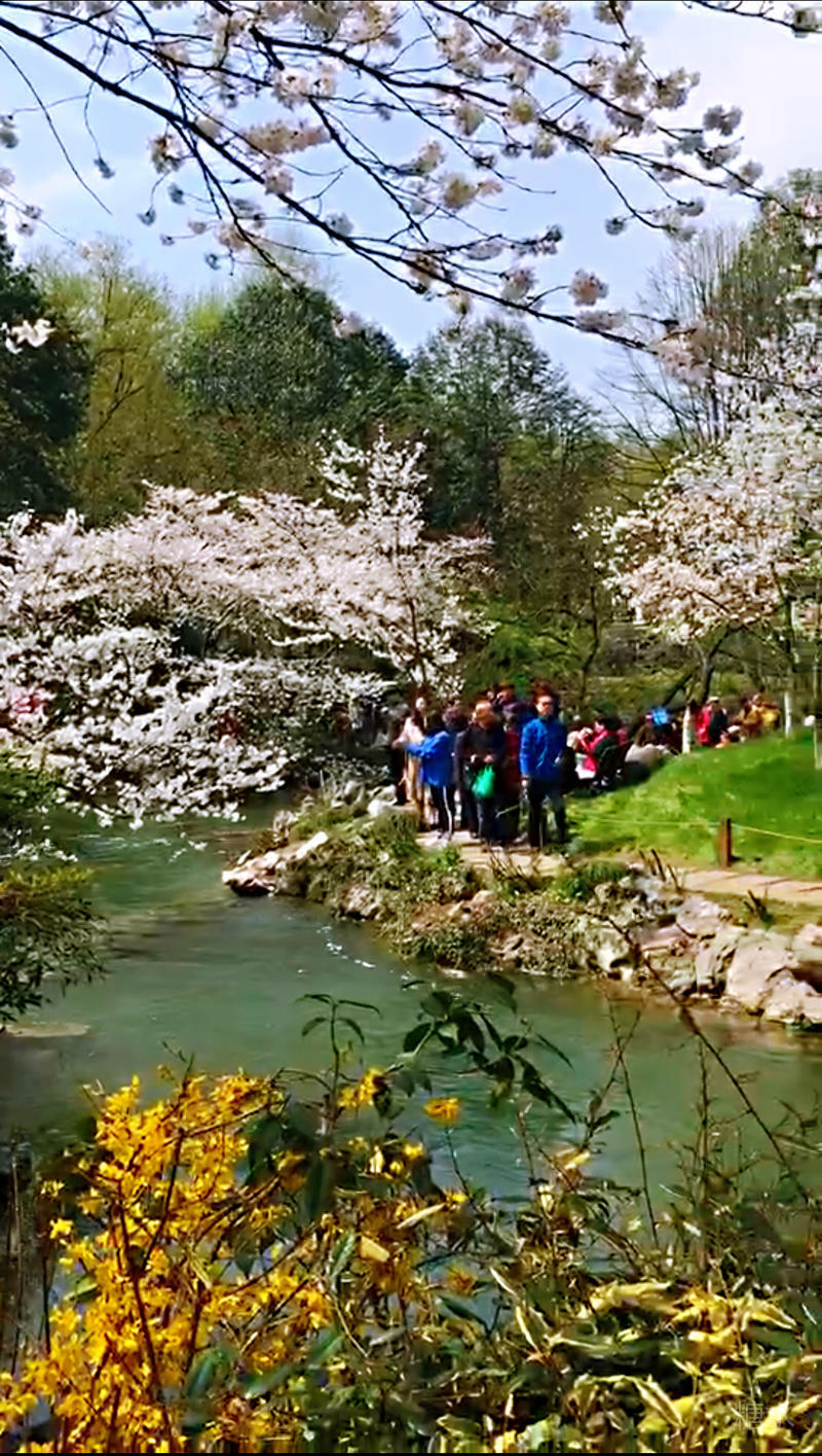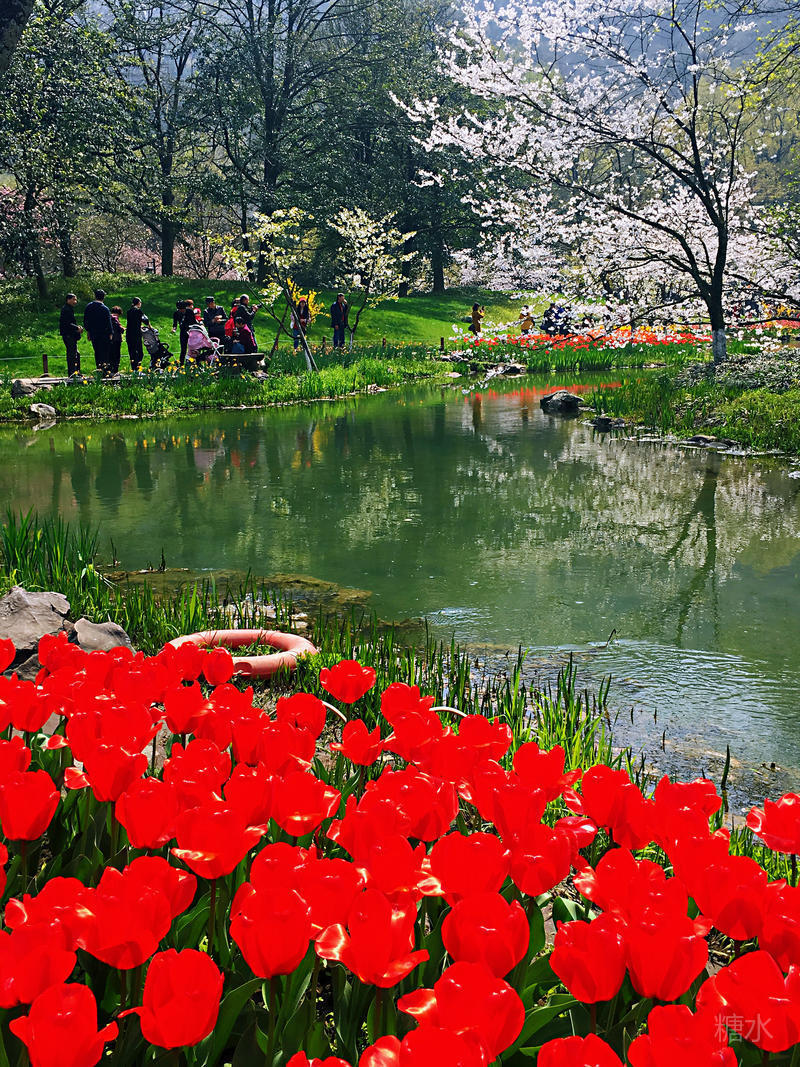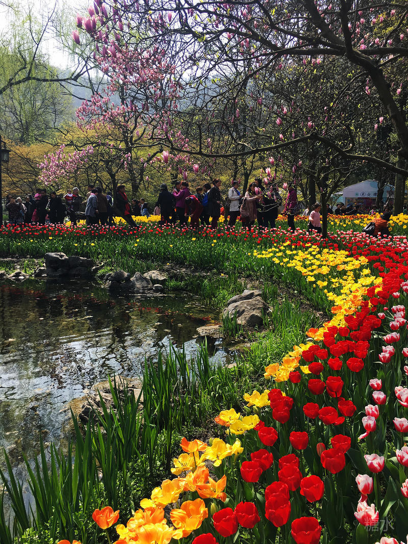 桥下是溪水、桥上是游人,溪边是游人、头上是樱花;远处五彩缤纷郁金香、近处漫天樱花如飞雪。流水声、嬉笑声伴着拍照的咔嚓声、随倒映着花海的波浪将温馨和浪漫渐渐送向远方......