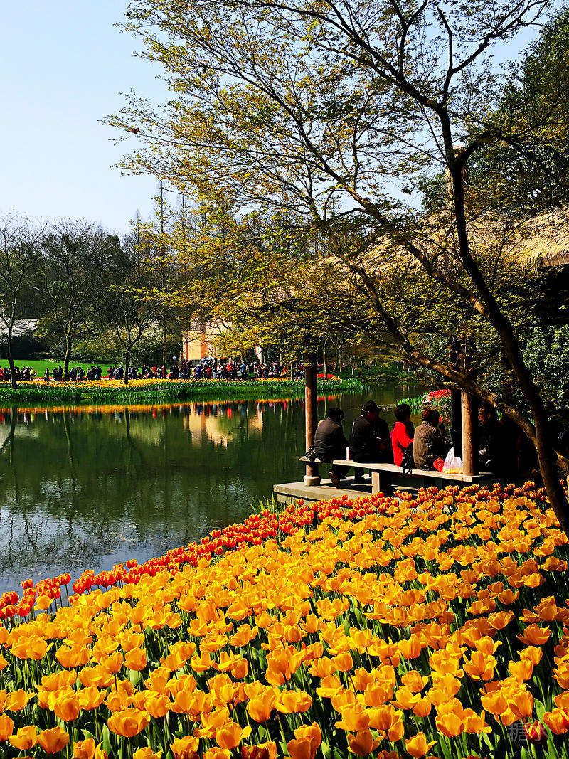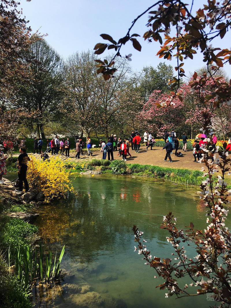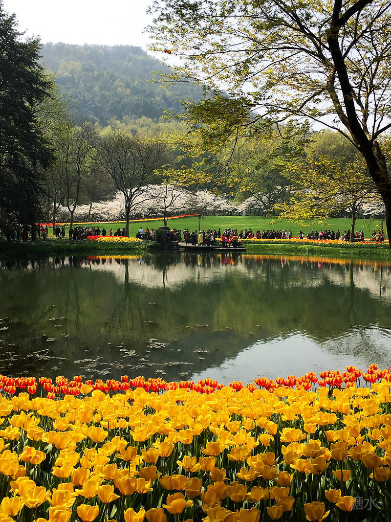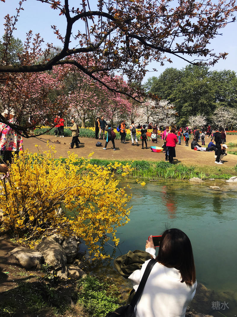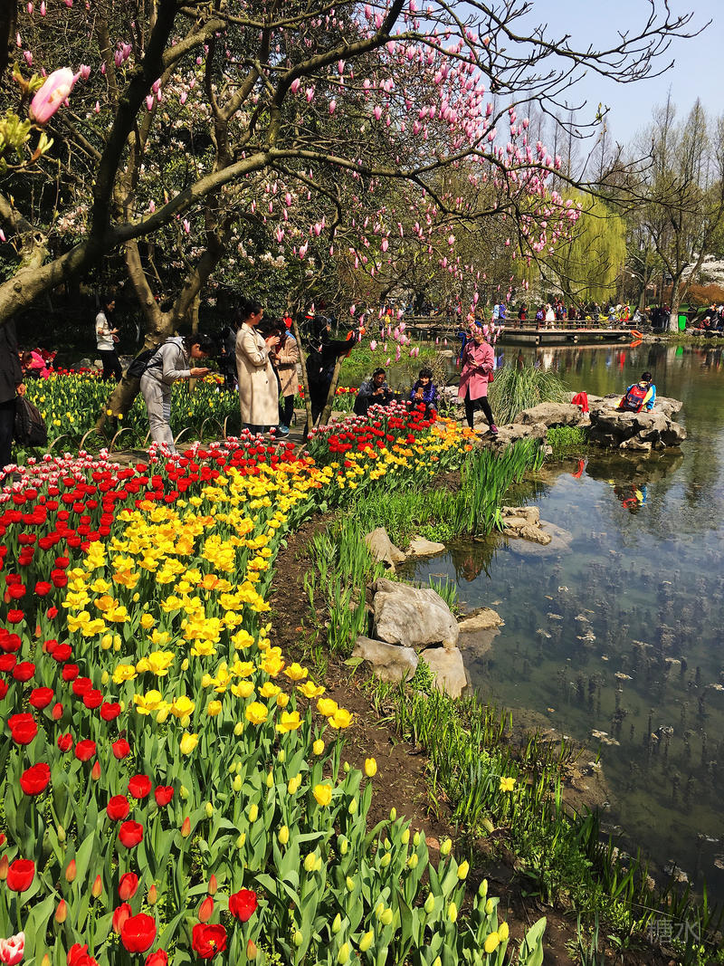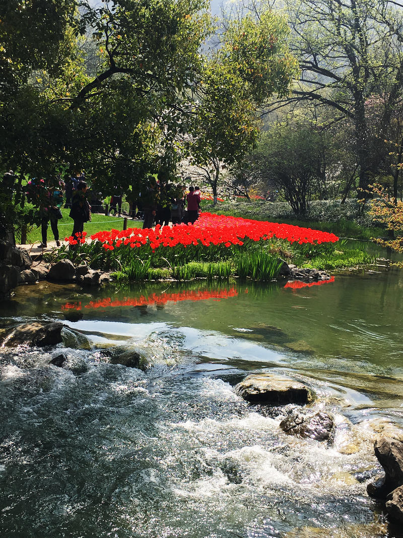 桥下是溪水、桥上是游人,溪边是游人、头上是樱花;远处五彩缤纷郁金香、近处漫天樱花如飞雪。流水声、嬉笑声伴着拍照的咔嚓声、随倒映着花海的波浪将温馨和浪漫渐渐送向远方......