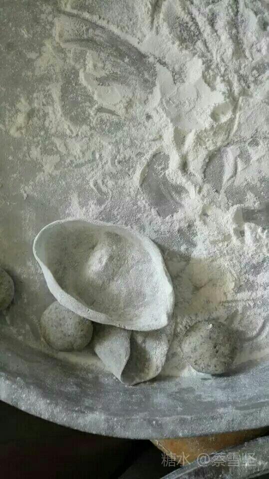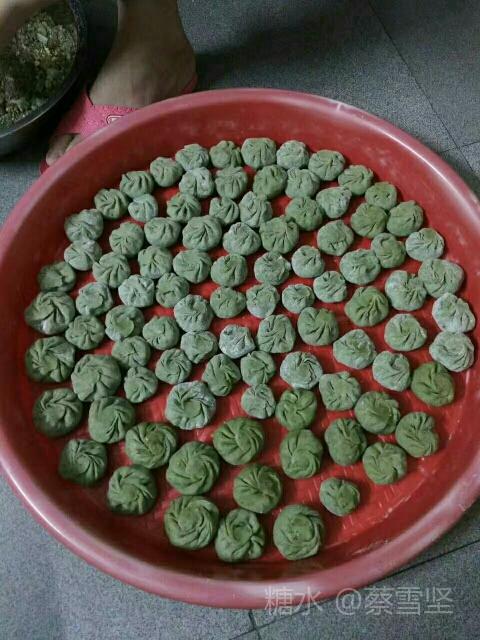 2.把洗净的鼠曲草和糯米粉掺和揉制成团块,作为粿皮。(这个过程则需要经验,要一点点地加温水掺和,直至到两种东西可以融合在一起,才能制作成粿皮。)