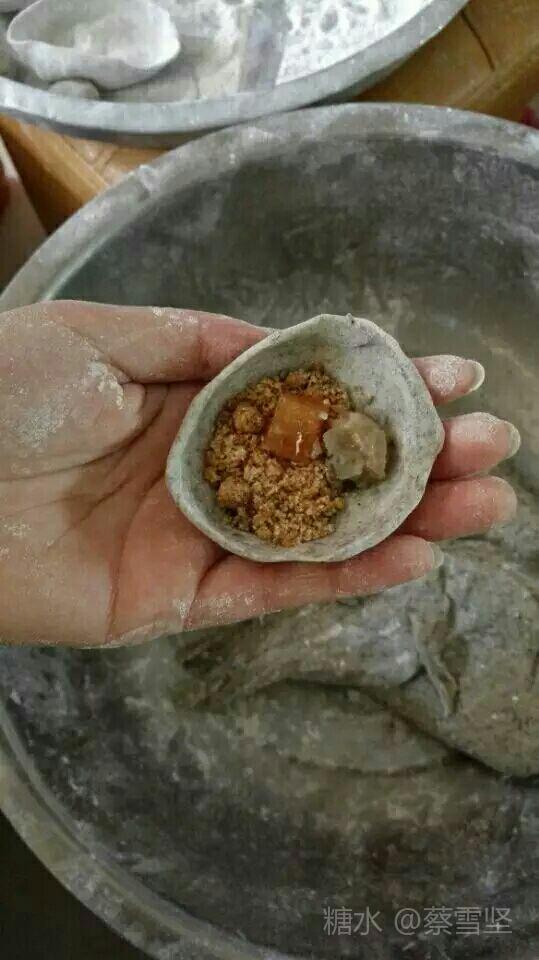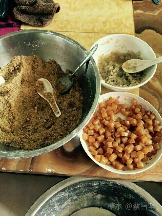 4.用炒熟的花生、芝麻、白糖、红糖捣碎掺和一起做成“鼠壳龟粿”的主馅。副馅则因人的口味而不同,可以加入瓜冬、猪油糖、小肥肉块、爆熟的葱花等。