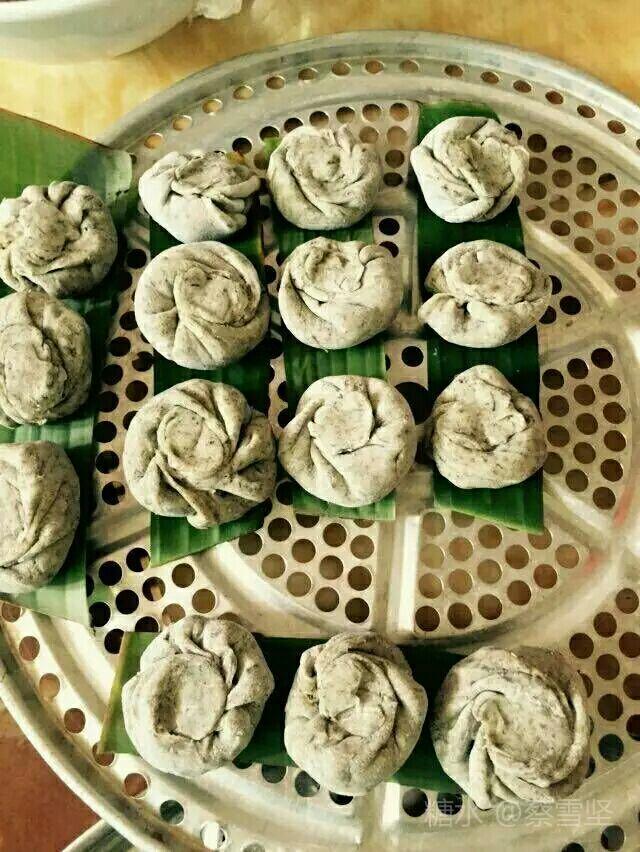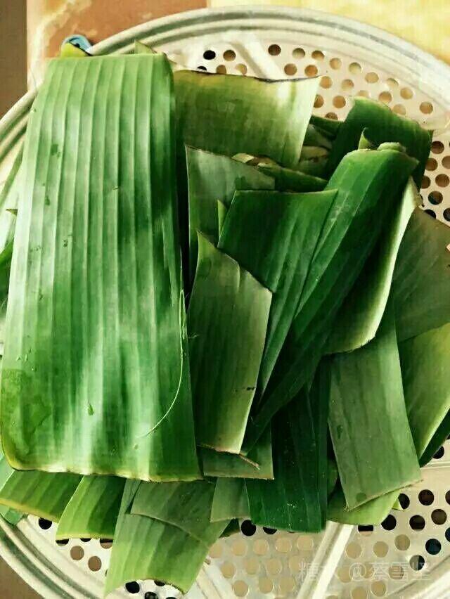 5.把各种馅加入制作好的粿胚,置铺有香蕉叶的蒸筛上,入鼎蒸熟即可食用,吃时撕去香蕉叶。