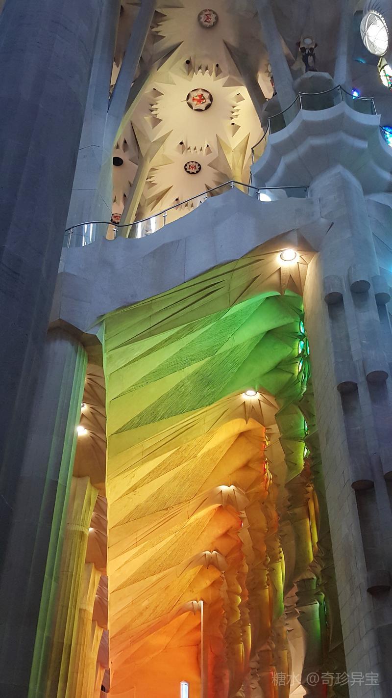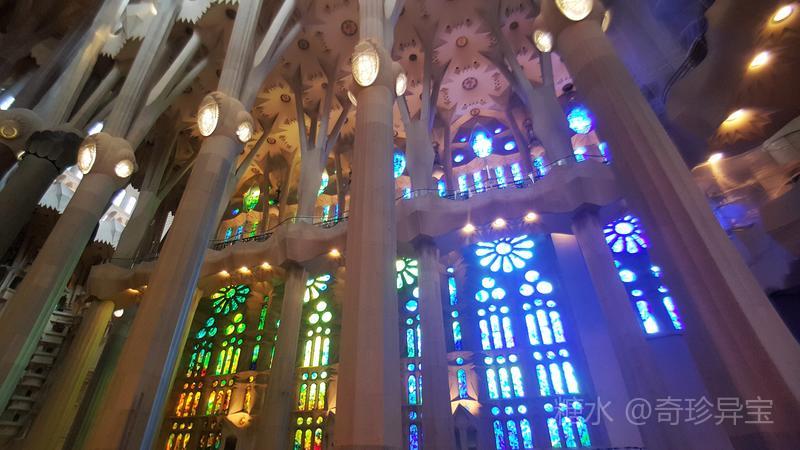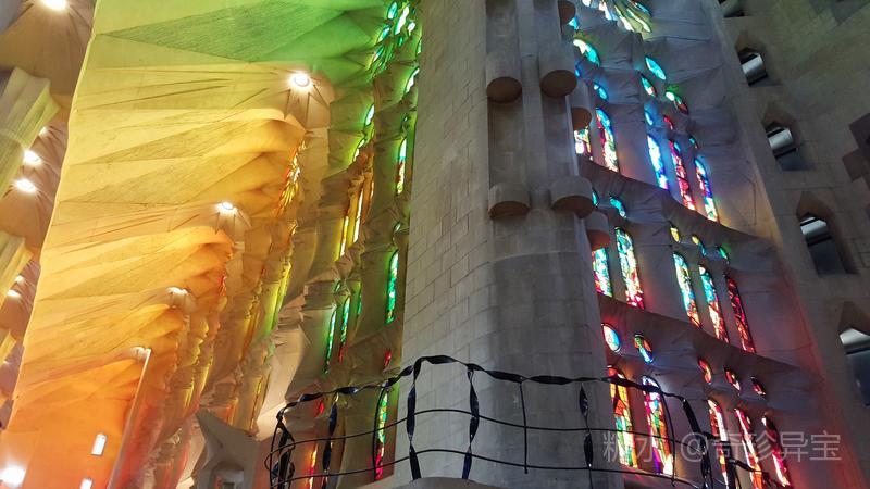 迷恋色彩的高迪选择在建造圣家堂时隐去了斑斓的色彩,而采用灰暗的石头。当一缕缕户外的光线透过彩色玻璃窗在教堂内画出一道道七色彩虹的时候才会明白,高迪是想将色彩留给上帝