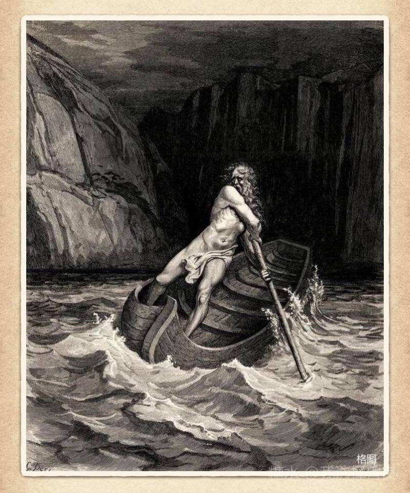 维吉尔拉着他继续向前走,来到一条大河边,许多人聚在河岸边急着等待渡河。这条河就是阿刻隆河——幽冥界的愁河,鬼魂们要从这里过河去地狱。 魔鬼卡隆驾着船冲过来, 他对着鬼魂们大喊:“你们这些罪恶的鬼魂,你们该遭劫了!我来送你们到对岸!送你们去永恒的黑暗!” 接着他又冲着但丁喊叫:“ 你是活人的灵魂,离开那里,会有另一条小船送你从别的渡口上岸!”