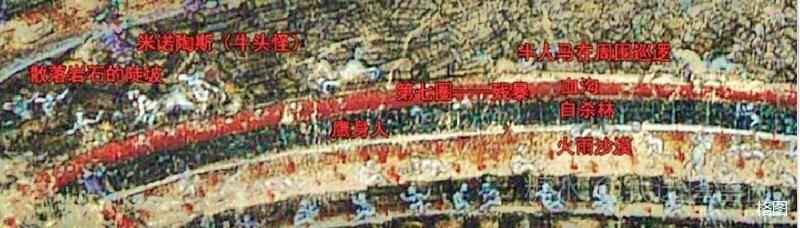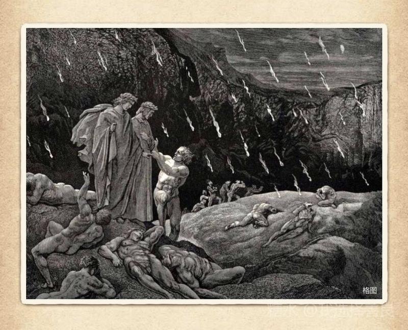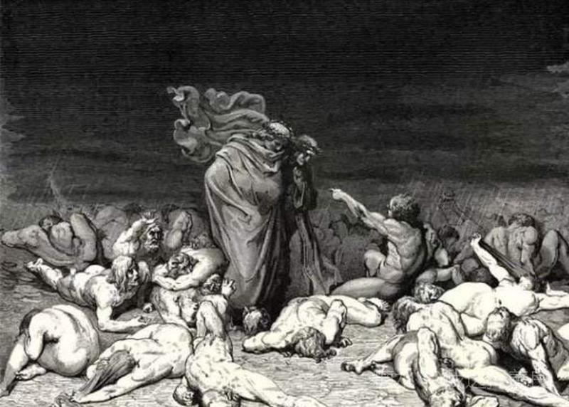 第七圈的第三环 火雨沙漠 第三环是又干燥又厚的沙漠,这里火雨在不停地下,空中飘落一片片巨大的火花,沙地就像火绒碰上火镰一样燃烧起来,更使痛苦加倍。 许多灵魂在接受不同的惩罚,他们都哭得十分凄惨,渎神者仰卧在滚烫的沙地上,高利贷者缩成一团坐着,犯鸡奸罪者排着队在不停的走,那些受苦的灵魂扑打着飞落到身上的火星,片刻不得歇息。 迎面遇到一队犯鸡奸罪的鬼魂,脸上都被烧得破了相,其中一个曾是但丁的老师勃鲁内托,他们互相认出来,但勃鲁内托不敢停下来交谈,他说自己一旦停下片刻,就要被罚躺一百年,火雨打在身上也不能挡。但丁只好随着他们行走的队伍和老师交谈。 .......