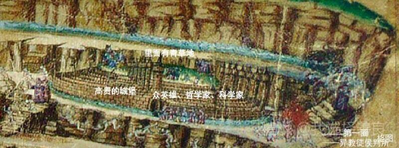 但丁跟随维吉尔身后,走进环绕地狱深渊的第一圈。 这里没有哭声,只有叹息声,在这儿聚集着一大群人,他们没有罪过,有很多杰出人物,他们都生在基督教诞生以前,因为不能进入天国而叹息。 在第一圈里,他们遇到了古希腊诗人荷马、古罗马诗人贺拉斯、奥维德和卢卡努斯...... 维吉尔和但丁走到一座高贵的城堡前,城堡有七道高墙围绕,周围还有一条美丽的小河,他们渡过小河,穿过七道城门,来到了一块青翠的草坪上,许多伟大的灵魂都聚集在这里。
