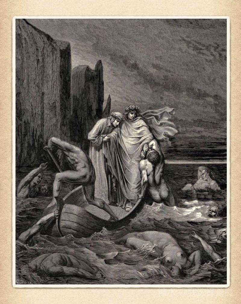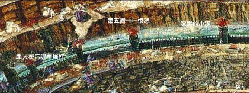 走到一个泉眼边,黑色的泉水汩汩流淌着,他们顺着浑浊的溪流,由一条崎岖的小路下到这一个圈里。 凄惨的小溪流到灰色的陡坡下,积成一个沼泽。沼泽中的灵魂,个个都赤身裸体,满身污泥,满面怒容,他们互相撕打着、踢撞着,用牙齿去撕咬对方的身体。 在岸边,维吉尔和但丁上了一条小船,在行驶中,一个佛罗伦萨人的灵魂腓力浦把手伸向了小船,但丁认出是自己仇恨的政敌,就把他推下去,沼泽中那些浑身污泥的灵魂高声叫骂着,腓力浦被他们狠狠地殴打、撕裂。