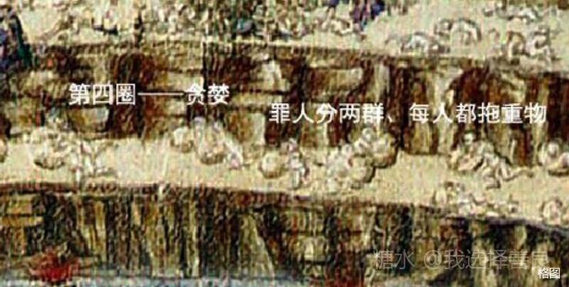 但丁问维吉尔,能否认出几个被这些罪恶玷污的人? 维吉尔回答他:“那是妄想啊,他们生前是非不明,如今被罪恶玷污,面目模糊无法辩认,他们将永远不停地在半个圈里的两头碰撞。在最后审判到来的时候,贪财者会从坟墓里爬出来,攥紧拳头表示他们的执迷不悟,浪费者会光着脑袋从坟墓中爬出来,表示他们已经是一无所有,倾家荡产。”......