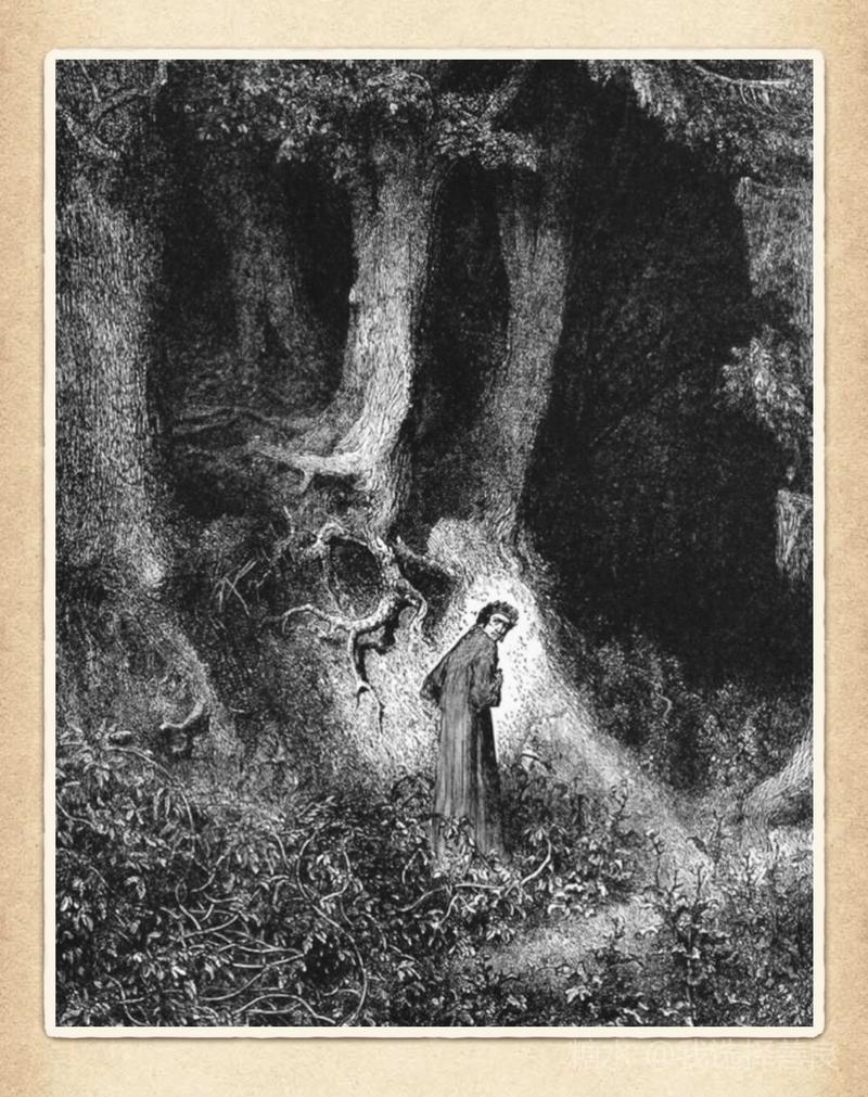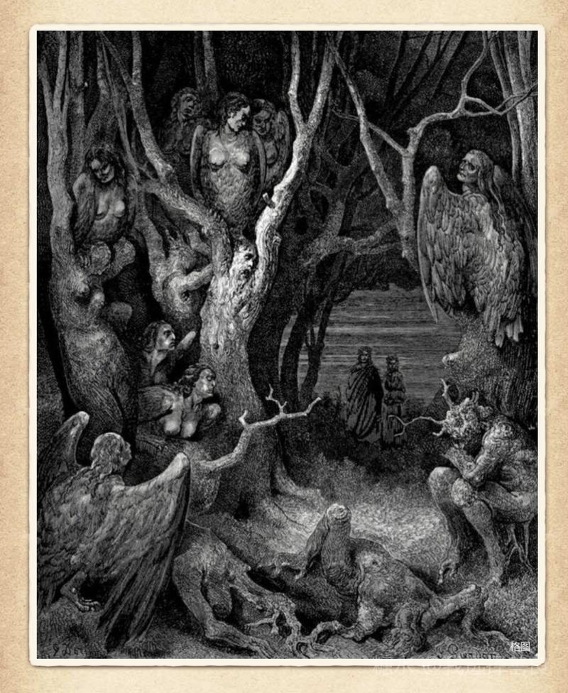 第七圈的第二环 自杀林 维吉尔请求帮助,一个肯陶尔背着但丁渡过血水河,来到第二环。 这是一座森林,树叶不是绿的,而是黝黑的颜色,树枝曲里拐弯、疙疙瘩瘩的,树上没有果实,只有毒刺。 但丁听到枝柯之间传出了哭声,却看不见人,维吉尔要他去折断一根小枝子,他刚折下枝子,树茎就喊:“ 你为什么折断我?你太残忍了!我们从前都是人啊!如今已经变成了树!” 那折断树枝的伤口一边流血一边说话,他说自己是彼埃尔,曾经供事于罗马皇帝腓特烈二世,因为忠诚而受嫉妒陷害,出于激愤而自杀。他告诉但丁这林中的树都是自杀者的灵魂,当他们来到地狱时,就被打发到这里,变成野生枯萎的毒树......