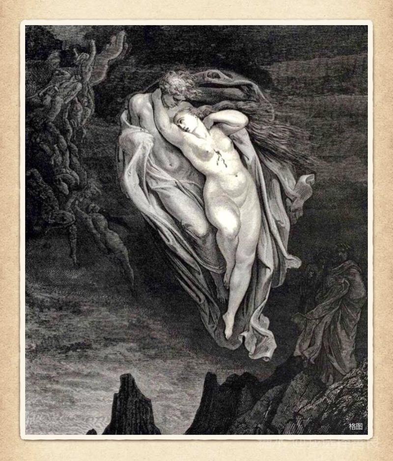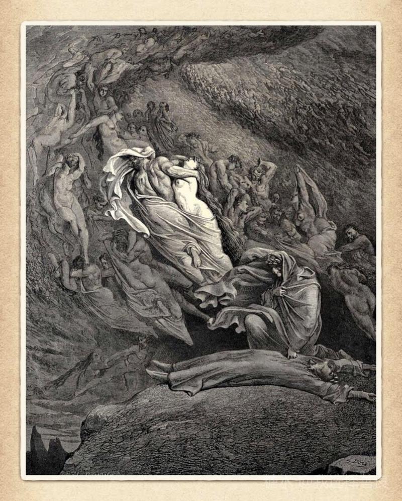 这是犯淫邪罪灵魂受苦的地方。这一层的圈子比较小,痛苦却很大。 狂飙猛烈地席卷着群魂飘荡,刮得他们旋转翻滚、相互碰撞,痛苦万分,就像一群椋鸟密集成群,在寒冷的季节展翅乱飞。他们无法休息也没有减轻痛苦的希望。 这里有迦太基的女王狄多、埃及的艳后克利奥帕特拉、有引发特洛亚战争的海伦和帕里斯、还有古希腊的英雄阿基琉斯...... 他们都是“因为爱情离开人世的灵魂”,自杀和被杀的人。