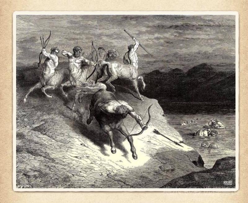 第七圈的第一环 血河 第一环是沸腾的血水河,煮着用暴力伤害他人者的灵魂。河边上有许多肯陶尔(半人半马的怪物)成队奔跑,他们围着河走,看到有鬼魂从血水中露出身子,超过他罪孽规定的限度,就用箭来射。河里被煮的人高声号叫,有的被血水一直淹到眉毛。 这是些杀人流血的刺客、掠夺臣民财富的暴君、恶名远扬的海盗和强盗,他们在血水河中为自己的暴行抵罪。但丁认出许多恶人的灵魂。