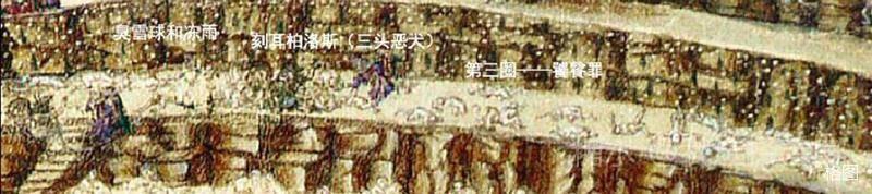 在这一层里的是生前犯贪食罪者的灵魂,他们生前大吃大喝,放纵食欲,死后到这里来接受惩罚。 这一层下着寒冷的冻雨,大颗的冰雹、雪和黑水从空中倾泻而下,使地面发出臭味。长着三个头的恶犬刻尔勃路斯狂吠着,它的眼睛赤红,黑胡须上沾满油脂,用它的爪子把倒在污地上的灵魂抓起来,撕成碎片。他们翻滚着痛苦万分。 恶犬发现了他们,就张开三张嘴,呲着尖牙,四肢紧张的颤动。维吉尔抓起满把的泥土扔到它的食管里,恶犬只顾把泥土吞下去,肮脏的嘴脸才肯安静下来。 他们在被大雨浇倒的阴魂中走过,一个佛罗伦萨人恰科认出了但丁,同他搭话一会儿,随即又倒下,像其他灵魂一样继续趴在污泥里.....