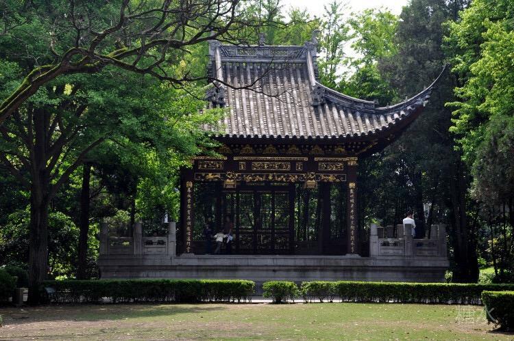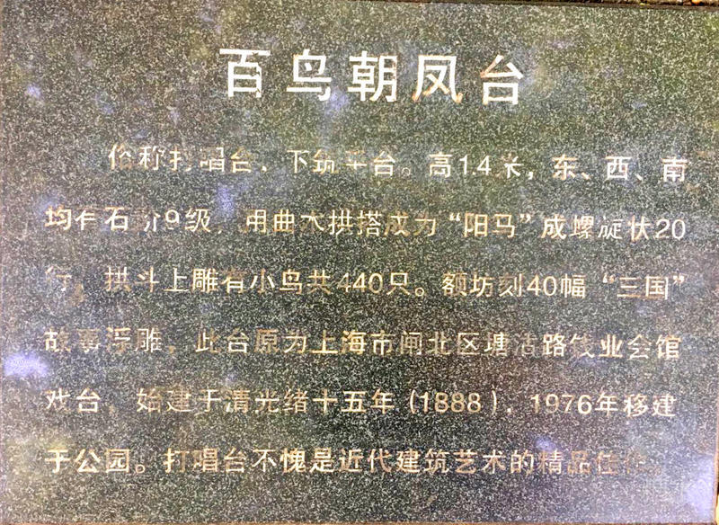 在侯黄先生纪念碑东南部。是从市区迁来的一座“百鸟朝阳台”,俗称打唱台。下筑平台高1.4米,东、西、南均有石阶9级,周有围栏、望柱。台为歇山顶、鱼龙鸱吻脊,中塑“万年青”,二端饰“三国”人物图案。定胜暗亮四垂脊,收头处塑“三国”人物立像。象鼻昂斗拱架构,镂雕花纹垫拱板,重椽,四戗角塑座兽各5只。筒瓦盖顶,如意瓦当。中央圆形百鸟朝阳榫合藻井,最高处嵌“明镜”一面。藻井用曲木拱搭成“阳马”螺旋状20行,拱头雕有小鸟440只,四方“角蝉”塑仙鹤,周有蝙蝠垫拱扳,额枋刻40幅“三国”故事浮雕。北额正中镂雕双龙戏珠、天狗、蝙蝠,二側有凤穿牡丹、垂花柱。南额下置屏风4扇,上部格式穿花,下部正、反浅雕8幅“三国”人物图像,两旁万穿挂落飞罩,台东西两侧置万字穿花护航靠,仿砖坐槛接水泥方柱。台前有平坦开阔大草坪,台旁有苍松翠柏、樟树、杉木,映绿掩翠,与东侧的曲池、小林雪松、桂花、枫杨相映成趣。此台原为上海市闸北区塘沽路钱业会馆戏台,始建于清光绪十五年(1888),1976年移建于公园。打唱台不愧是近代建筑艺术的精品佳作。