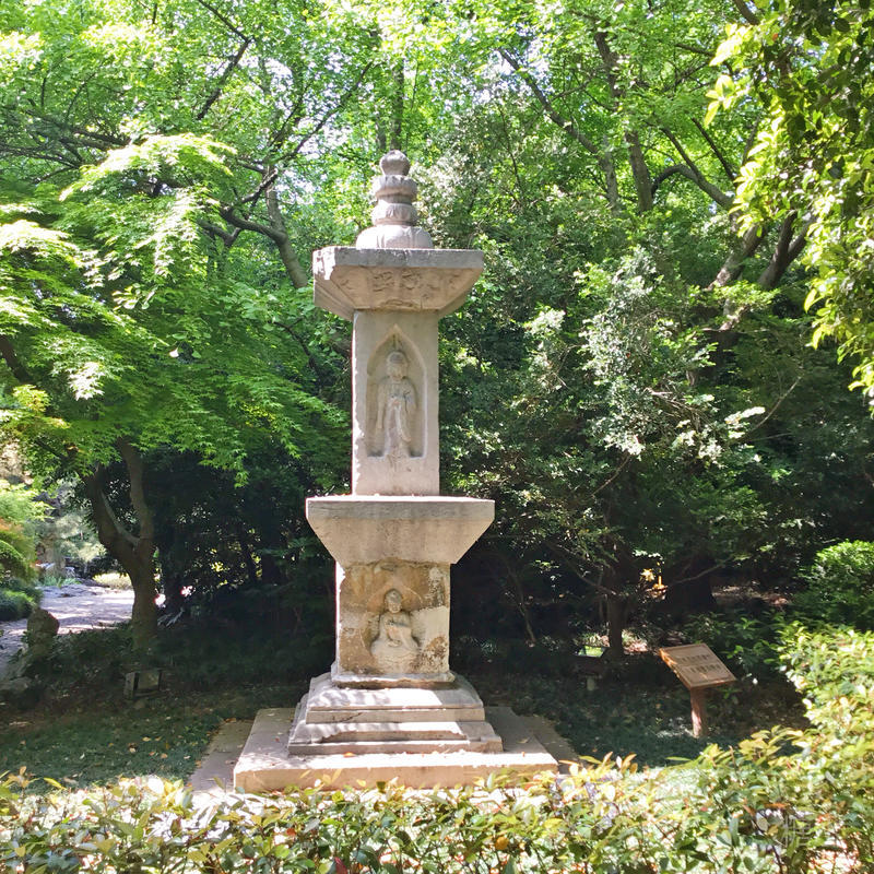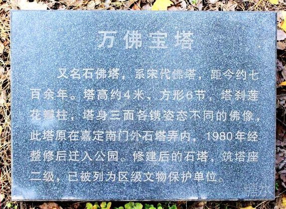 万佛宝塔,又名石佛塔,位于北草坪西侧。系宋代佛塔,距今约700余年。塔高约4米、方形6节,塔刹莲花瓣柱,塔身三面各镌姿态不同的佛像,并刻双龙、花纹等浮雕图案。一面刻经文,但因年久字迹已模糊不清。此塔原在嘉定南门外石塔弄内,1980年经整修后迁入公园。修建后的石塔,筑塔座二级,已被列为县级文物保护单位。